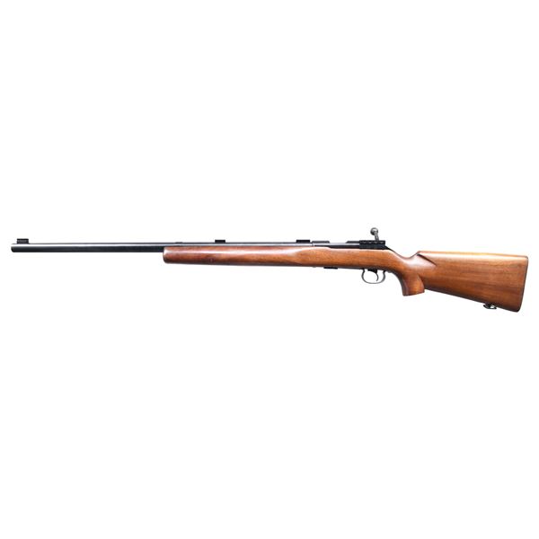 Cal. 22LR. S# 88660C. Bbl is 28" heavy target weight. Bbl is fitted w/ a front sight base and target scope blocks. Action has target sight base. Walnut target stock w/ accessory rail on forearm, checkered steel buttplate and inletted rear sling swivel. Manufactured in 1956. Mag: 1 detachable 5-rd. CONDITION: 90% blue. Stock is lightly refinished showing scattered scratches and marks. Sound action and trigger. Very good bright bore. (25-1562/DS). CURIO. $900-1,200.