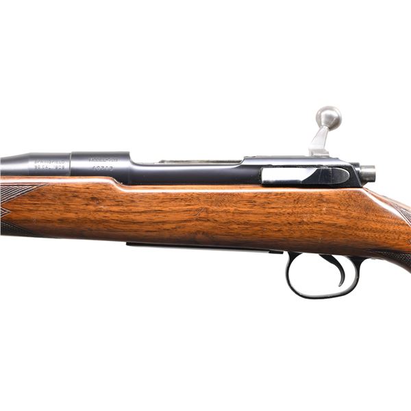 Please note as of 5/6/25 this item description has been updated. Please revisit this description and contact us with any questions. Cal. 30-06. S# 40713. Bbl. 22". Bbl. band ramp mounted bead front sight w/ elevator adj. sporting rear sight. Greatly improved version of the 1917 Enfield action. Classic style walnut stock w/ hand checkering, sling swivels & checkered steel buttplate. Replacement alloy trigger guard and floorplate has incorrect screw closure. Action cocks on opening. Only 2,500 mfg. 1941-44. CONDITION: over 95% original blue. Rear receiver bridge has 1 open hole. Original stock finish shows numerous scratches & marks. (24-2595/DS). CURIO. $2,000-3,000.