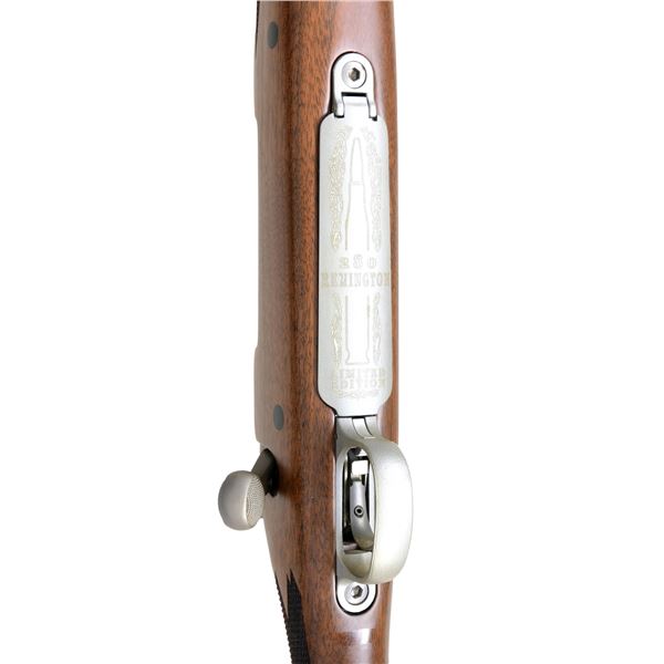 RIFLE. Cal. 280 Rem. S# S6719458. Bbl. 24" fluted w/o sights. Stainless steel construction. Floorplate has gold filled 280 Remington limited edition markings. Classic style cheekpiece walnut stock. Features include cut checkering, black forearm tip & grip cap, swivel bases & black Remington pad. Limited edition mfg. 2010. UNATTACHED ACCESSORIES: original box containing owner's manual, NRA card, hang tags & trigger lock. Box shows moisture damage. CONDITION: as new, appears unfired. (24-4343/DS). MODERN. $1,000-1,500.