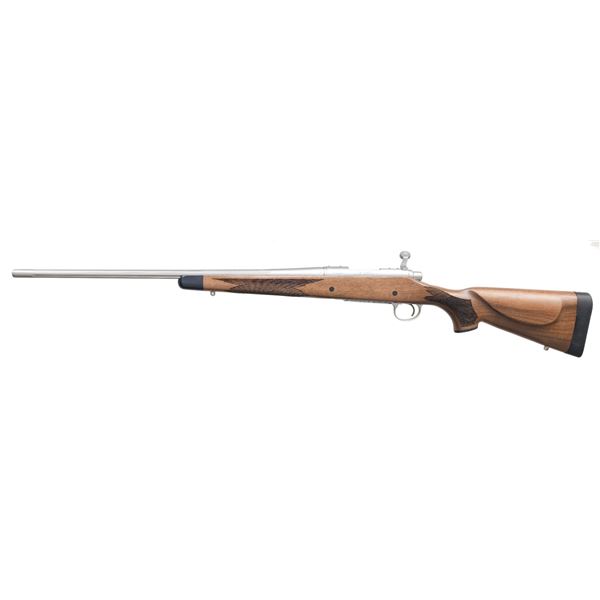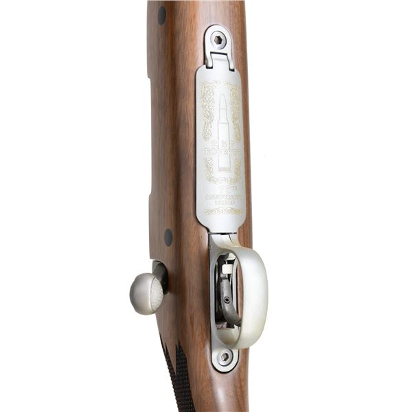 ACTION RIFLE WITH MATCHING FACTORY BOX. Cal. 257 Roberts. S# S6681654. Bbl. 24". Model 700 CDL SF Limited Edition bolt action rifle mfg. by Remington in 2009. Left side of the bbl. is marked with Remington's mfg. information and the cal. designation, with the left side of the receiver being marked with the S#, followed by the Remington trademark logo above "MODEL 700 LIMITED". Floorplate is engraved with scroll work surrounding a bullet and "257/ ROBERTS" above "7th ANNIVERSARY/ LIMITED". Metal components exhibit a satin stainless steel finish, save for the aluminum trigger guard and hinged floorplate, which exhibiting a gray enamel type finish. Bolt body is jeweled. Checkered wood pistol grip buttstock with cheek piece and black tipped forend. Receiver is factory drilled and tapped. Bolt is matching to the receiver via "1654". UNATTACHED ACCESSORIES: matching factory box. CONDITION: excellent, with metal components retaining virtually all of their original factory finishes overall, exhibiting a few small dark flecks over the top of the chamber from cleaned oxidation. Mirror bore, exhibiting some grease, while retaining well defined rifling throughout. Stock is excellent overall, save for a few scratches and marks on the left side, just above the trigger area. Box shows some exterior wear, as well as some water damage, but otherwise remains sturdy and serviceable. (24-4341/MLW). MODERN. $1,000-1,500.