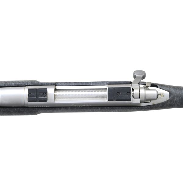 Cal. 7mm STW. S# S6332448. Bbl. 26" fluted. Rifle lacks sights but has receiver two Weaver bases. Stainless finish with jeweled bolt body. Gray carbon fiber stock set with factory recoil pad & bottom mounted sling studs. LOP: 13 1/2". CONDITION: stock shows some light staining, scuffs & handling marks. Metal shows a few specks of light oxidation & some scattered light handling marks. Action functions properly when hand cycled . Very good bore. (25-1184/MJC). MODERN. $800-1200.