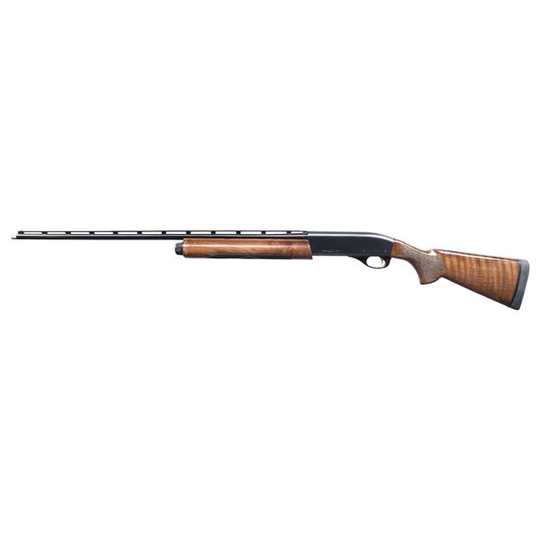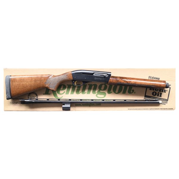 Cal. 410. 2 1/2". S# RS90822X. Bbl. 27" vent rib w/ Remchokes, full set of five tubes included. White front bead w/ steel mid bead. Blued gas operated action w/ gold finished trigger. Right side is marked "Sporting 410". Nicely grained walnut forearm & capped pistol grip stock w/ cut checkering, gloss finish & original solid black Remington pad. UNATTACHED ACCESSORIES: original box containing plug, safety lock, spare chokes & owner's manual. CONDITION: near excellent, retaining 99% wood & metal finish. Bright near excellent bore. (25-904/DS). MODERN. $1,800-2,500.