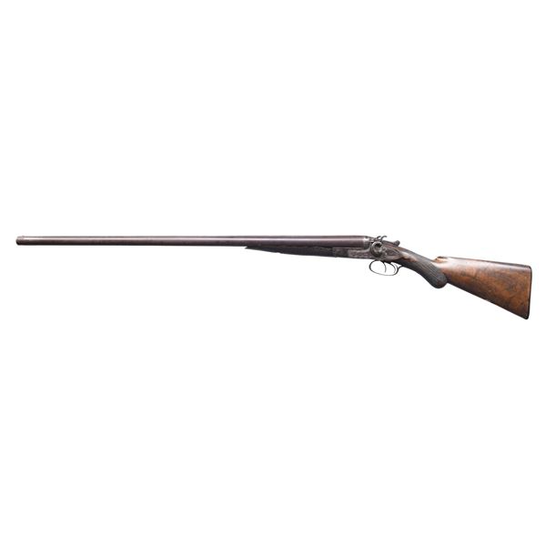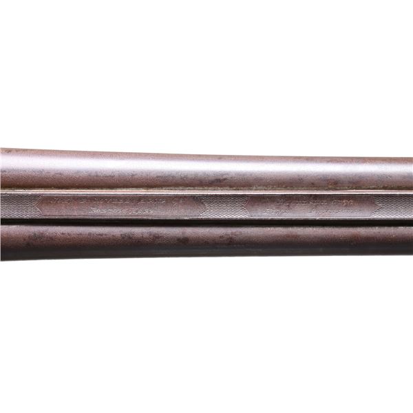 SXS HAMMER SHOTGUN. Cal. 12 Ga., 2 5/8". S# 38112. Birmingham made gun with pre 1896 Birmingham proofs on water table, retailed by John P Lovell Arms Co. The Damascus 30" barrels have matted rib with address & brass bead; fixed Full & IC. chokes. Receiver has Birmingham proofs on water table with sprays of acanthus scroll throughout. Locks are stamped "JOHN P LOVELL ARMS CO BOSTON" with engraved of pheasant scenes. Action features double triggers, crossbolt fastener & extractors. Walnut splinter forearm with Deeley release & pointer pattern checkering. Round knob pistol grip buttstock with checkering & German silver nameplate on toeline. LOP: 13 1/8" to highly figured hard rubber buttplate showing woodland elk & doe scene. CONDITION: metal has dark brown patina with spots of corrosion throughout. Splinter forearm heavily worn with chip on left barrel channel & extra varnish applied. Wood heavily worn around checkering with epoxy repair behind left lock, numerous dings & marks along with scattered small cracks. Buttplate has crack near toe. Bores show pitting & sm. dents. Right lock hammer missing screw, both firing pins missing bushing. (01-26846/MD). ANTIQUE. $200-400.