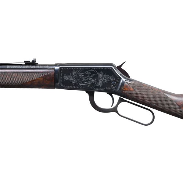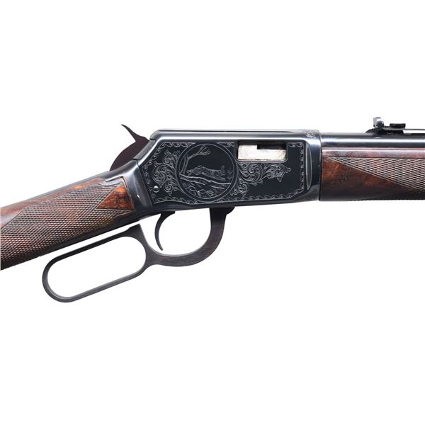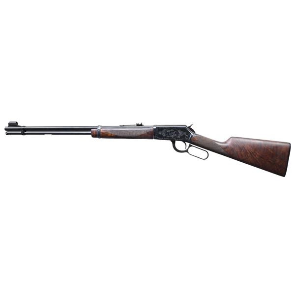 RIFLE. Cal. 22 S, L, LR. S# F291624. Bbl. 20" round w/ hooded ramp front sight & pre-64 style sporting rear sight. Full length mag. Action has unsigned hand engraving in factory style 10. Right side vignette shows a running rabbit. Left side shows a squirrel on a limb. Scenes are surrounded by vine type foliate scroll w/ punch dot backgrounds & curled borders. The scroll work continues to upper & lower receiver areas. Forearm & straight grip custom aftermarket stocks of very fancy black walnut having burl figure & dark tones. Borderless wraparound hand checkering. Original style plastic buttplate. CONDITION: beautifully upgraded gun, retaining over 95% reblued metal finish having small spots of corrosion w/ areas of rust where the stock meets the receiver. Wood has a good satin finish showing scattered small marks. Bright near excellent bore. (25-210/DS). MODERN. $1,000-2,000.