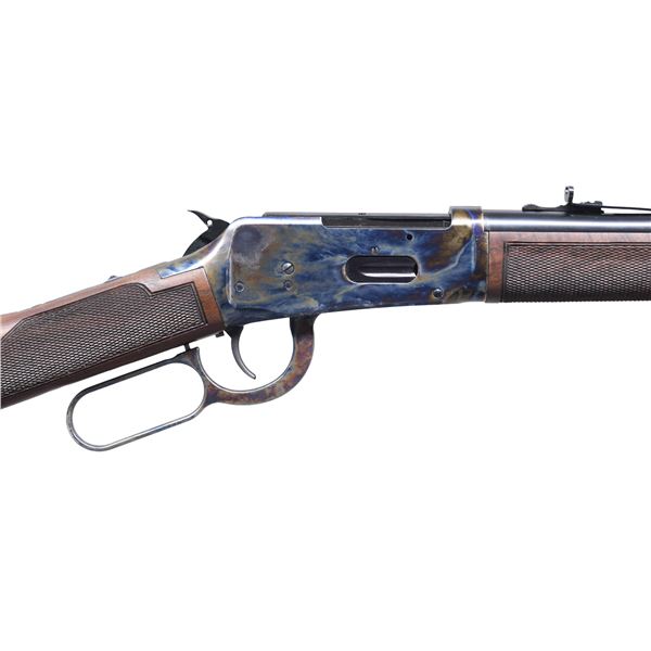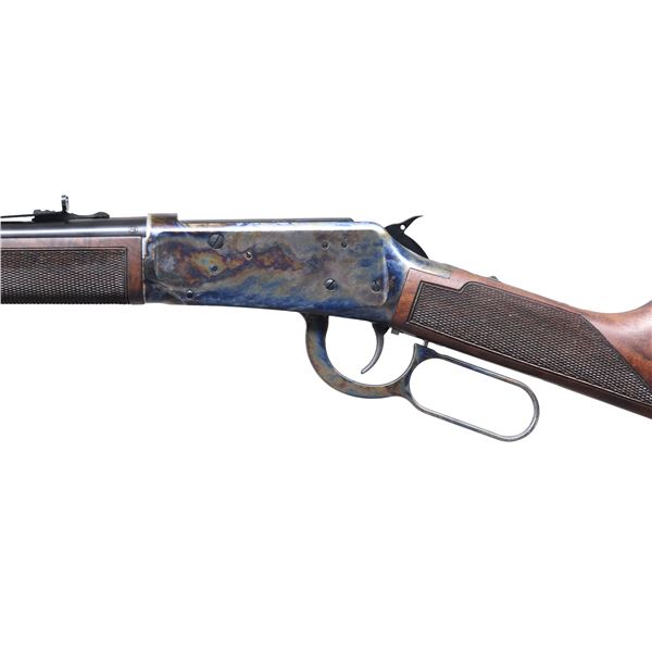 SHORT RIFLE WITH MATCHING FACTORY BOX. Cal. 38-55. S# WIJP00019YM94D. Barrel 20" w/ bead front & elevator rear sights. 7 Shot tubular mag. Case colored receiver drilled & tapped for scope mount having angle ejector & hammer fitted for extension. Highly graded walnut stock with cut checkering & shotgun buttplate. UNATTACHED ACCESSORIES: white box containing paperwork & lock. 2 Bags of 38-55 cases & Pacesetter 3 die set for 38-55. CONDITION: all aspects near excellent including bore; appears unfired with mag. tube has retailer sticker. (25-891/MD). MODERN. $800-1,200.