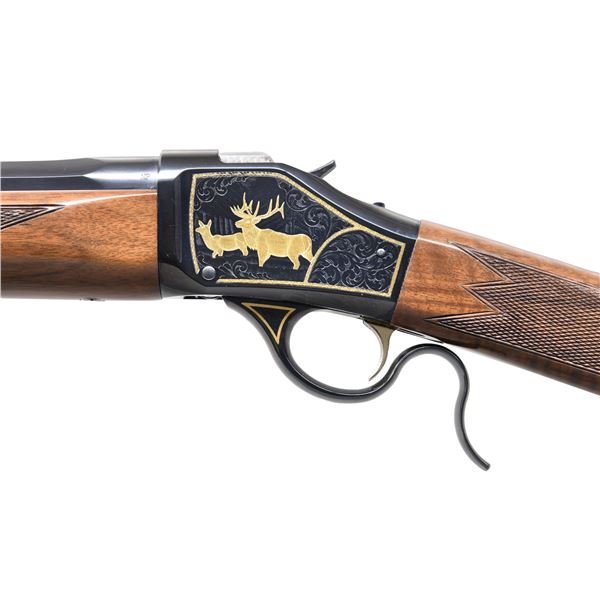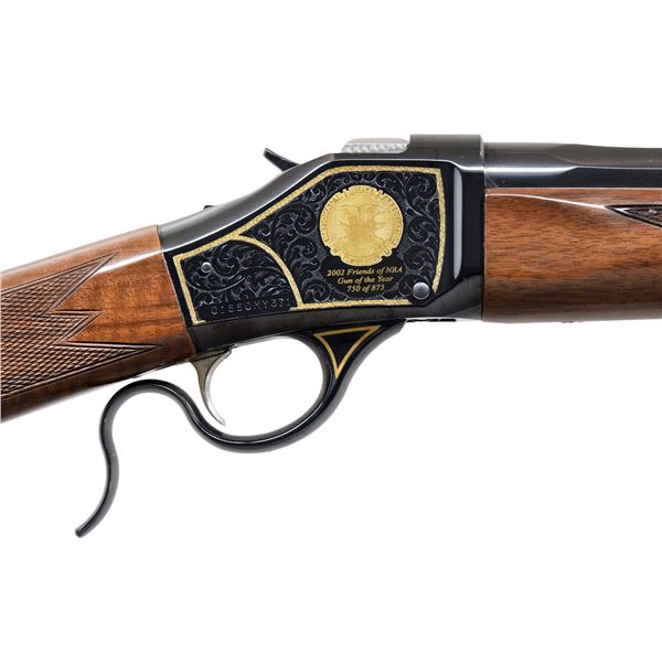 SHOT RIFLE. Cal. 45-70. S# 01550MY371. Bbl. 28" octagon. Replacement serrated ramp blade front sight w/ original sporting rear sight. Receiver has special ornamentation featuring gold plated elk on left side. Right side has gold NRA medallion w/ marking "2002 Friends of NRA / Gun of the Year / 750 of 875.". Markings are surrounded by vine type scroll ornamentation & borders. Bright blue finish w/ nickel finished serrated trigger. Sides of breech block are machine jeweled. Schnable tipped forearm & straight grip stock of nicely grained walnut. Features include gloss finished, hand checkering solid black Browning pad & swivel bases. CONDITION: near excellent retaining over 98% metal finish. Bright near excellent bore. PROVENANCE: Lifelong Collection of Bill Peterken. (24-6195/DS). MODERN. $800-1,200.