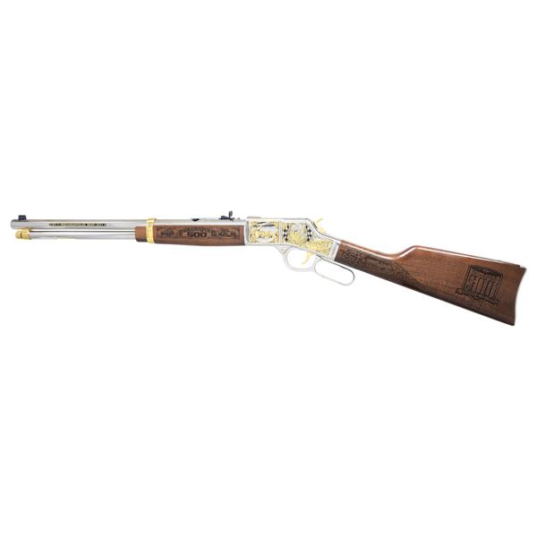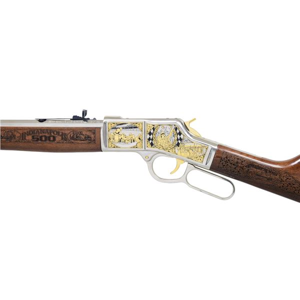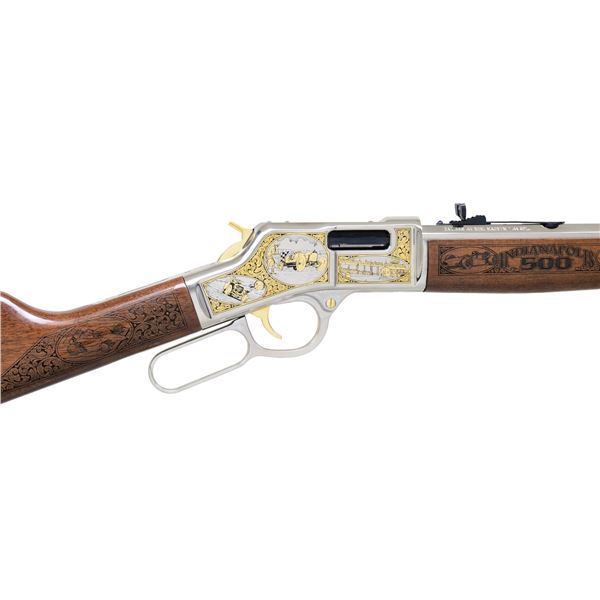 RIFLE. Cal. 44 Mag/Spl. S# BB0172523. Bbl. 20". Gold bead front sight. Sporting rear sight. Henry Big Boy model H006 engraved by A&A Engraving of Rapid City, SD to commemorate the Indy 500 100th anniversary. Rifle is numbered 67 out of 100. Nickel finish with 24 Karat gold highlights & engraving scenes of the Indy 500. Walnut stock set with laser engravings of the Indy 500 scenes. UNATTACHED ACCESSORIES: matching numbered factory box with manual & matching numbered certificate of authenticity. CONDITION: all aspects near new in the box. (25-1032/MJC). MODERN. $2000-4000.