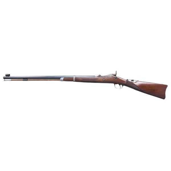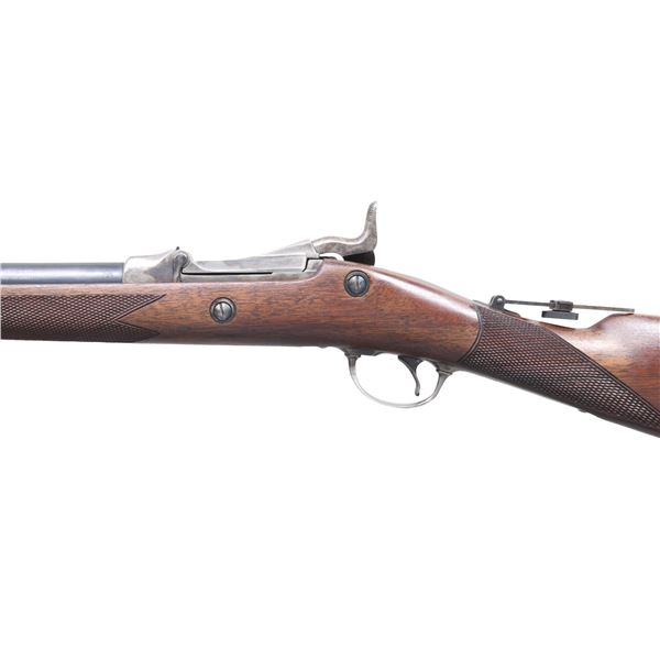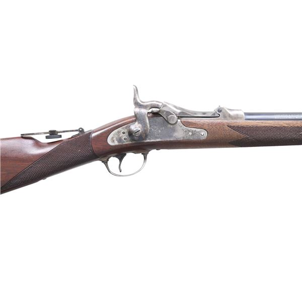 TRAPDOOR SINGLE SHOT RIFLE. Cal. 45-70. S# EXP12. Bbl. 26" round. Globe front sight w/ Vernier tang sight. Case colored action w/ vine type foliate scroll ornamentation having American eagle on lockplate. Band fastened walnut carbine stock. Features include cut checkering, engraved Pewter nosecap & case colored engraved carbine buttplate. Hardwood ramrod held by a single pipe. CONDITION: over 98% bbl. blue. Case coloring shows some fading. Stock finish shows a few small marks. Sound action. Bright near excellent bore. PROVENANCE: Lifelong Collection of Bill Peterken. (24-6191/DS). MODERN. $800-1,200.