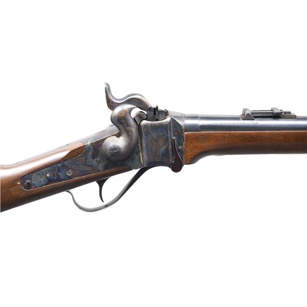 Cal. 45-70. S# 24732. Round 22" barrel. Blade front sight & ladder leaf 800 yd. rear sight. Case colored action with saddle ring & bar on left side. Walnut stock set with carbine buttplate. CONDITION: all aspects very good to near excellent with notable chip at peak of buttplate along with scattered minor handling marks. Shiny bore with strong rifling. (24-7123/MD). MODERN. $700-1200.