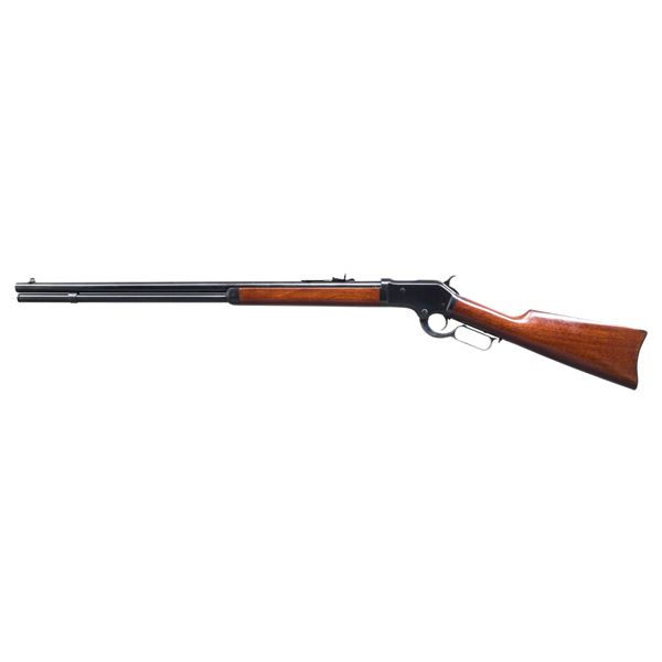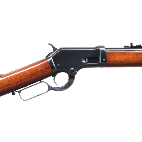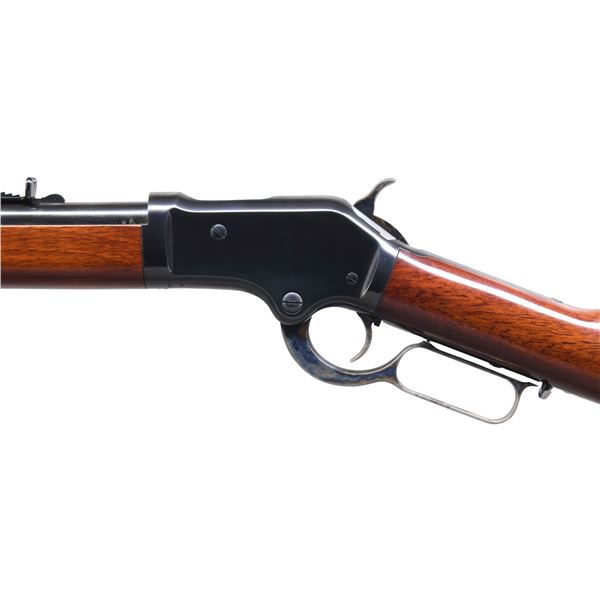 Cal. 45 Colt. S# M00161. Bbl. 25 1/2" round. Full length tubular mag. Blue finished w/ case colored hammer, trigger & lever. Gloss finished walnut forearm w/ stock & steel carbine buttplate. UNATTACHED ACCESSORIES: original box. CONDITION: near excellent retaining nearly all metal finish. Wood finish shows a few small marks. Bright near excellent bore. (24-6618/DS). MODERN. $1,000-1,500.
