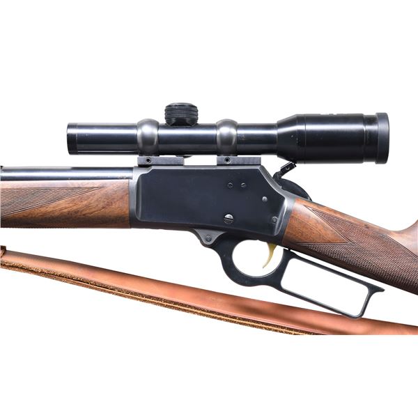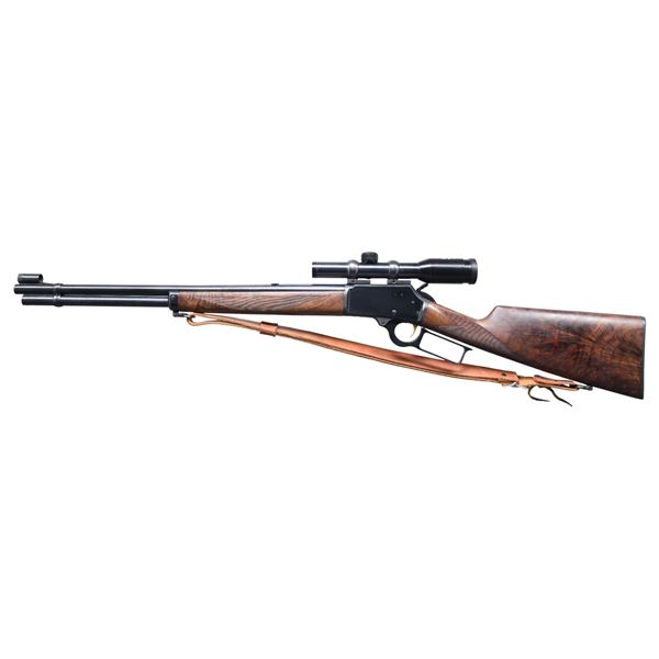 KAHLIS SCOPE. Cal. 44 Rem. Mag. S# 24186590. Bbl. 20 1/4". Model 1894 lever action rifle mfg. by Marlin. Left side of the bbl. is marked with Marlin's mfg. information above the model and cal. designations, with an encircled "JM" proof stamped at the breech. Metal components exhibit a blue finish overall, with matte bluing present on the top and bottom straps of the receiver. Trigger exhibits a gold colored finish. High grade checkered wood straight grip buttstock and forend. Ramped, hooded, and brass beaded blade front sight. Rear sight is absent and fitted with a dovetailed blank. Hammer features a thumb extension. Receiver is mounted with a Karl Kahles Helia S 2.5x20 scope. CONDITION: metal components retain the majority of their original factory blue finish, exhibiting some light wear, as well as some superficial handling marks overall. Left side of the receiver exhibits an area in the top right corner that appears to have been touched up at one time. Mag. tube exhibits striations and thinning from prior cleaning. Mirror bore, exhibiting some light to mild surface oxidation on the lands, while retaining well defined rifling throughout. Wood furniture shows a few superficial marks from handling and storage, but otherwise remains sturdy and serviceable. Scope retains a clear and sharp optic. PROVENANCE: From the Estate of Jon Thomas, Gunsport, LTD. (25-1074/MLW). MODERN. $900-1,400.