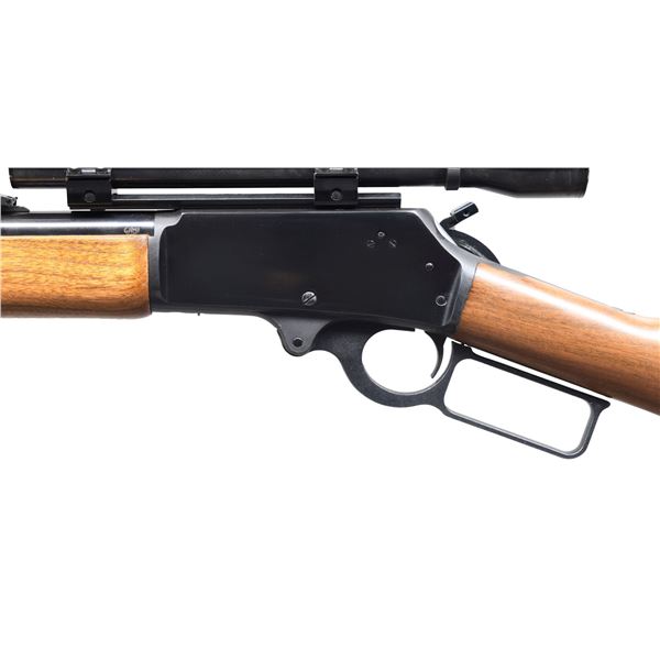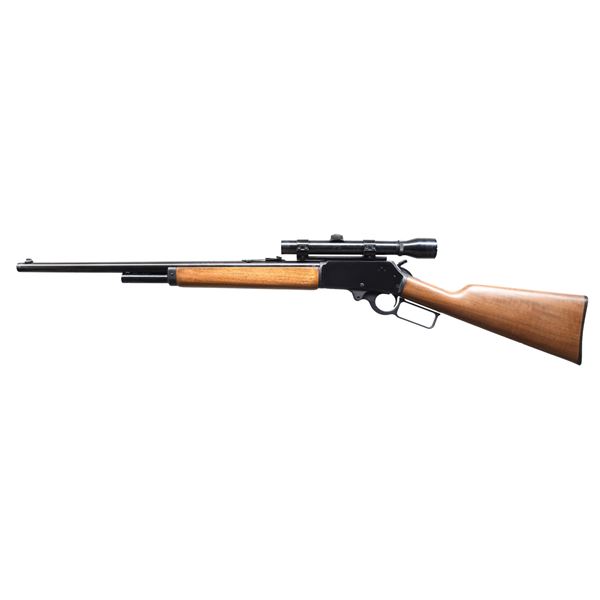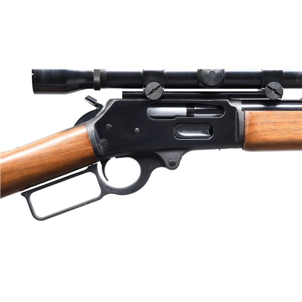 Cal. 45-70. S#. B010662. BBL. 22" round w/ micro groove rifling. Bead front w/ sporting rear sight. Weaver K3-F gloss finished scope w/ fine crosshairs on Weaver mounts. 2/3 length mag. Action has cross bolt safety & hammer extension. Walnut forend & straight grip stock w/ original buttplate. CONDITION: over 98% wood & metal finish. Bright near excellent bore. (24-3387/DS). MODERN. $700-1,000.