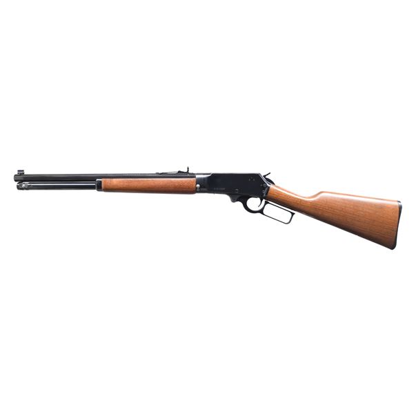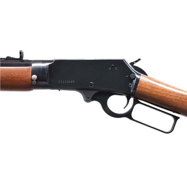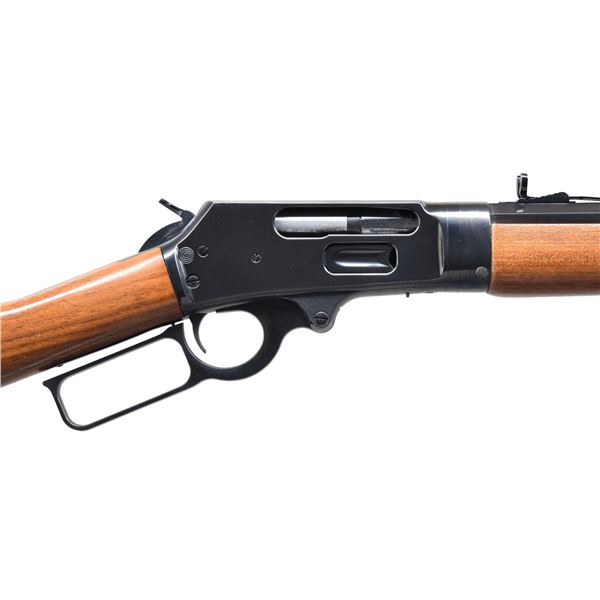 RIFLE. Cal. 45-70. S# III00022. Custom takedown conversion by an unidentified builder. Conversion is accomplished by a 7/8" extension between the receiver & bbl. assembly w/ a push button release. Bbl. octagon shortened to 18 1/4". Bead front sight w/ sporting rear sight. Mag. tube is shortened to correspond w/ bbl. length & has a push button release allowing for forward movement of takedown. Blue finished action has push button safety. Walnut forearm & straight grip stock w/ original buttplate. WEIGHT: 6 lbs, 13.8 oz. CONDITION: near excellent as converted retaining over 98% reblued finish. Left bbl. flat shows small nicks. Very good wood finish. Right side of forearm has a shallow dent along bbl. channel. Bright near excellent bore. PROVENANCE: Lifelong Collection of Bill Peterken. (24-6028/DS). CURIO. $1,000-2,000.