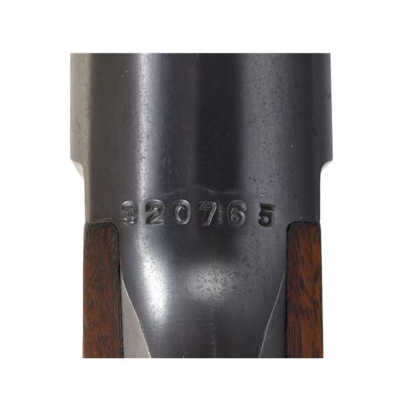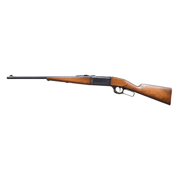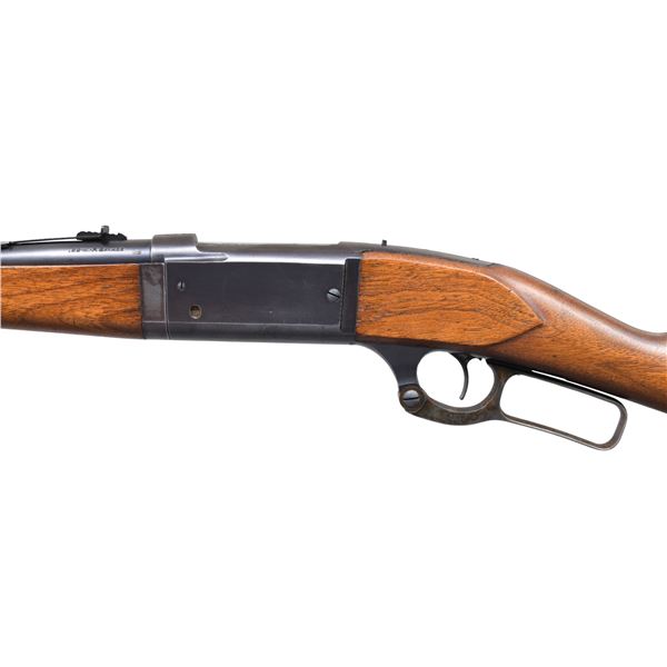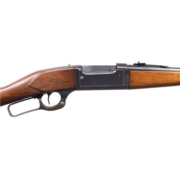 Cal. 22 Hi Power & 410, 2 1/2". S# 320765. Bbl.1: 22 HP. 22" round w/ ramp mounted bead front sight & sporting rear sight. Bbl.2: 410, 2 1/2". 22" round w/ brass front bead. Featherweight takedown action. Features include brass rotary mag., left side shell counter, cocking indicator & bent tab safety. Blue finish w/ case colored lever. Schnable tipped walnut forearm & straight grip stock w grooved steel buttplate. Combination kit consists of a basswood veneer case covered with a black cobra grain artificial leather. The case holds the takedown rifle & the accessory 410 shotgun bbl. The extra shotgun bbl. allowed the sportsman the advantage of taking small game while on a camping trip w/o carrying a second gun. UNATTACHED ACCESSORIES: case & shotgun bbl. CONDITION: over 80% lightly worn original blue showing carry & edge wear. The lever retains 70% dark faded case colors. Wood finish shows light wear w/ scattered marks. Both bbls. have very good bright bores. (25-895/DS). CURIO. $3,500-5,500.
