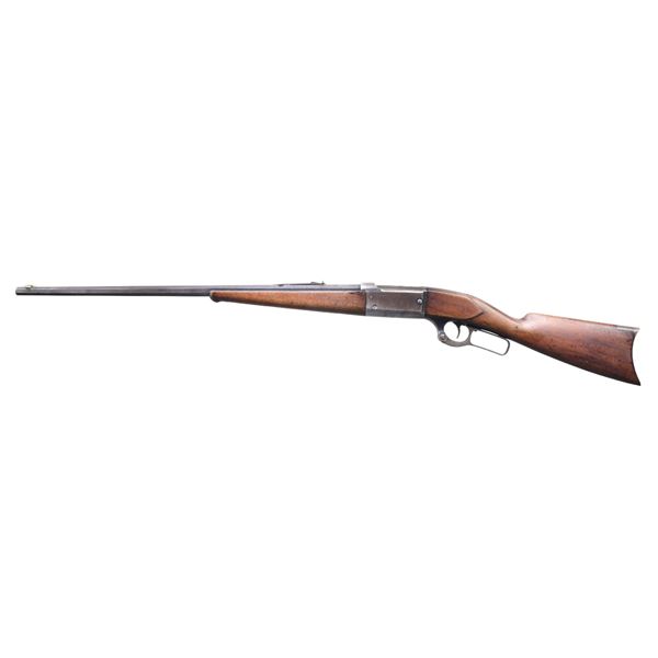 Cal. 303 Savage. S# 78.073. Bbl. 26" octagon. German silver blade rocky mountain front sight w/ sporting rear sight. Action features brass rotary mag., left hand shell counter, cocking indicator on bolt & bent tab safety. Blue finished w/ case colored lever. Schnable tipped forearm & pistol grip stock w/ crescent steel buttplate. Mfg. 1908. CONDITION: bbl. retains 40% dull fading blue showing spots of freckling. Action blue is fading to gray/brown. Lightly refinished wood has worn appearance w/ scratches & marks. Stock is broken at head w/ small crack at toe. Forearm & stock have open holes for sling swivel attachment. Dark bore w/ lightly worn rifling. (25-506/DS). CURIO. $700-1,000.