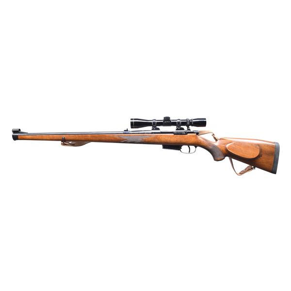 Cal. 222 Rem. S# 100792 (1157 indicates Nov. 1957 mfg). Matching number "92" on bottom of receiver, bolt & 22" barrel. Right side of marked marked "KRIEGESKORTE & CO. STUTTGART". Left side of barrel & receiver have 1957 Ulm, Germany Nitro proofs. Hooded ramp blade front sight & 2 leaf rear sight. Control feed action with claw extractor. Leupold VARI-X 3-9x Compact scope with duplex reticle on dual dovetail two piece rings & bases; bases on grooved top of receiver. Mannlicher checkered walnut stock w/ nose cap, grip cap, & black pad. Stock interior appears to have glass bedding around receiver. Brown leather sling on swivels. MAGS: 1- 4 rd. CONDITION: very good fading original blue mixing with brown patina. Very good wood finish with light handling marks. Near excellent bore. Scope has very good finish with clear, serviceable optics. Magazine is loose in mag. well & can be dislodged without depressing mag. button. PROVENANCE: From the Estate of Jon Thomas, Gunsport, LTD. (25-1079/MD). CURIO. $1,500-2,000.