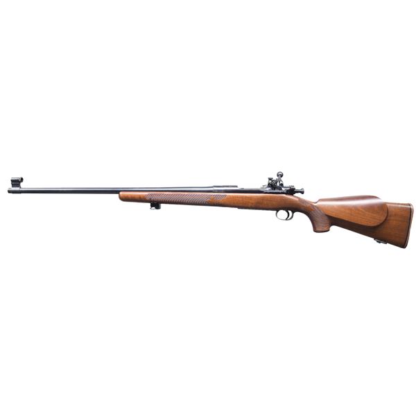 RIFLE. Cal. 30-06. S#. 1181777. Bbl. 24" unmarked. Band fastened globe front sight w/ a Lyman 48S receiver sight. Commercial single stage trigger. Original bottom metal. Custom Monte Carlo cheekpiece stock of nicely grained walnut. Features include borderless Fleur De Lis hand checkering, plastic grip cap, rear sling swivel & palm rest on forend acc. rail. LOP. 14 1/2" over an age hardened White Line rifle pad. Weight 8 lbs. 14.8 ozs. CONDITION: over 98% custom blue. Very good stock finish. Bore has a dark frosted appearance w/ worn rifling. (25-885/DS). Modern. $1000-1500.