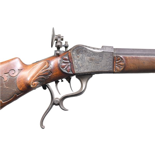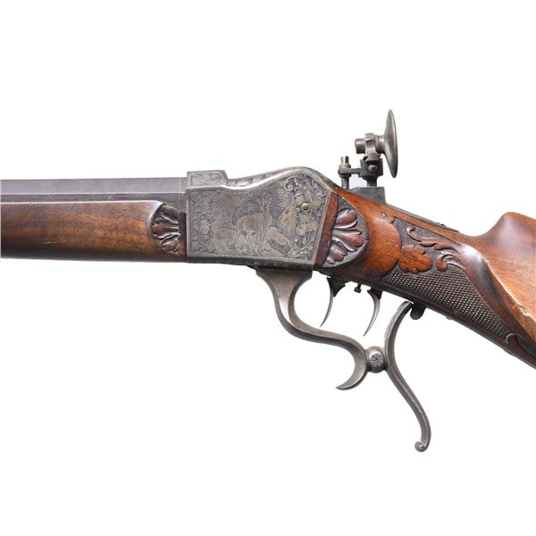 Cal. 4.5mm RF. S# NSN. The 24-1/2" octagon barrel has System Stiegele firing mechanism in front 6". Maker's name is platinum inlaid on top flat. Case hardened action without any openings has fancy finger lever and double set triggers. Pulling trigger causes a long rod to move forward firing cartridge which is close to muzzle. A large peep sight is mounted on top tang. Action is engraved with full coverage well cut acanthus scroll surrounding game scenes; chamois on left side and roaring stag on right. European walnut buttstock with heavy off hand buttplate has saddle type right hand cheekpiece and thumb rest. Stock exhibits well done acanthus carving surrounding some checkering. Matching forend screws to barrel. CONDITION: very good. Metal exhibits gray-brown smooth patina overall. Wood with most of its original finish has some marks. Bore is good; a bit dirty. Triggers work. (01-26558/MGM). ANTIQUE. $1,000-1,500.