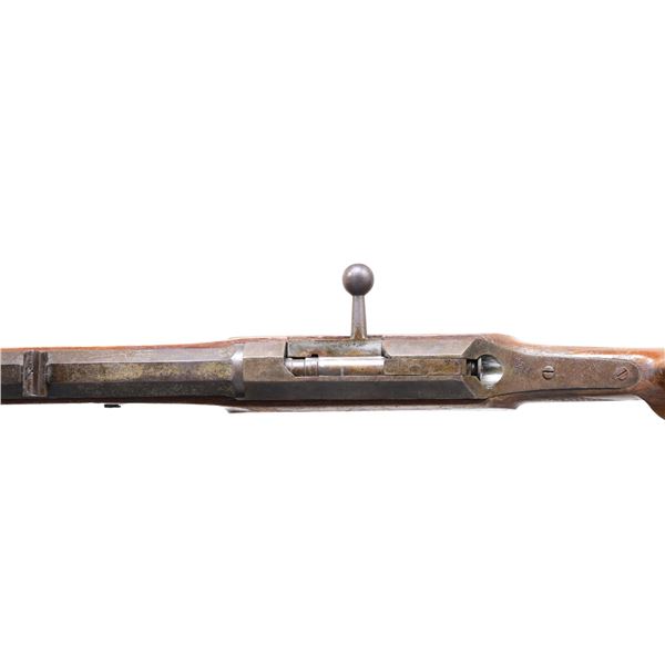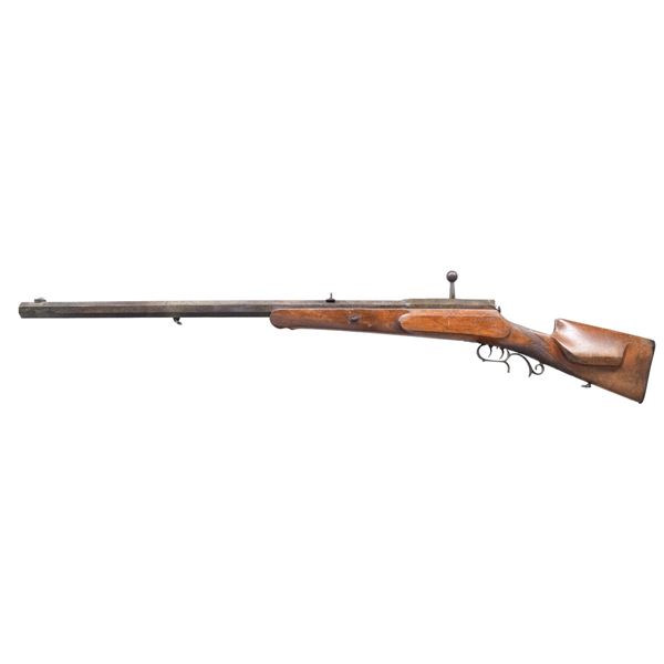 Cal. 16 Ga 2 1/2". S#10. Bbl. 32 3/4". Bead front sight. U-notch rear sight. German Vogelschiessen rifle made for eagle shooting competitions in which a wooden bird would be shot on top of a pole. Bottom of barrel has Suhl "826" German Nitro proofs indicatin Aug. 1926 mfg. for "913" bullet. Rifle appears unmarked & built on an upscale 1871 Mauser action. Double set triggers with finger curl trigger guard. Checkered walnut stock set with left side cheekpiece & bottom mounted sling swivels. UNATTACHED ACCESSORIES: a sheet of paper describing the rifle & German eagle shooting competitions. CONDITION: stock has added varnish with some chipping around butt, scattered flaking varnish, dings & handling marks. Metal is a dull gray patina with a couple areas of moderate tool marks on bbl. & moderate oxidation throughout. Action functions properly when hand cycled. Good bright bore with strong rifling but a few notable patches of pitting & oxidation. (24-6955/MJC). CURIO. $1000-1500.