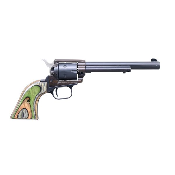 Cal. 22 LR / 22 Mag. S# E08474. Bbl. 6 1/2" w/ blade sight. 6 Shot fluted cyl. Matte black finish. 2 Piece green, gray & brown laminated grips. UNATTACHED ACCESSORIES: original box containing 22 Mag. rnd. cyl., trigger lock, instructions & accessory brochure. CONDITION: near excellent retaining over 98% finish showing sm. spots of finish loss on right side of frame by cyl. pin. Near excellent bore. (24-6531//DS). MODERN. $100-200.