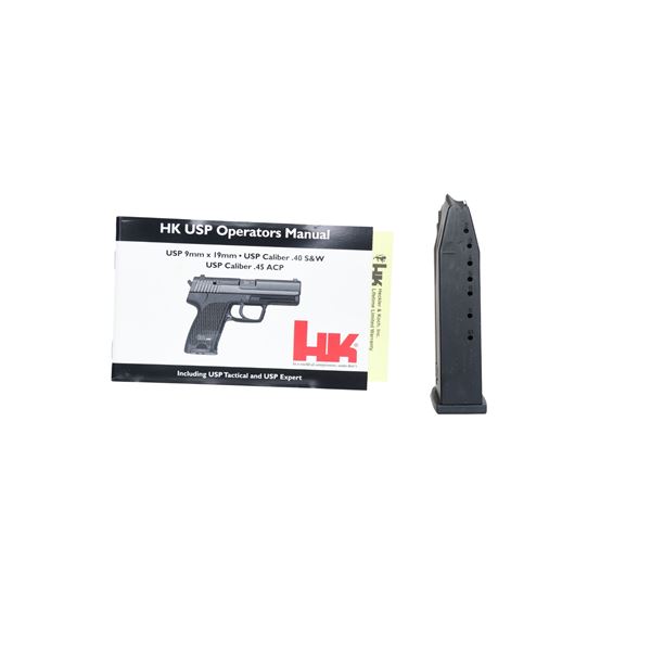 BOX. Cal. 45 ACP. S# 25-066354 (AA = 2000). This Heckler & Koch USP features a matte black finish. The barrel length is 4.25 inches. The front sight is a fixed blade, and the rear sight is a fixed notch. The frame configuration includes a manual safety and decocker lever on the left side, and a magazine release located at the trigger guard. The grips are textured black polymer. MAGS: 2-10 Rds. UNATTACHED ACCESSORIES: Original factory box and manual. CONDITION: Overall condition is near excellent with approximately 95% of the original finish remaining on the slide and frame. The bore is bright and sharp. MODERN (24-2236/MD) $500-$800.