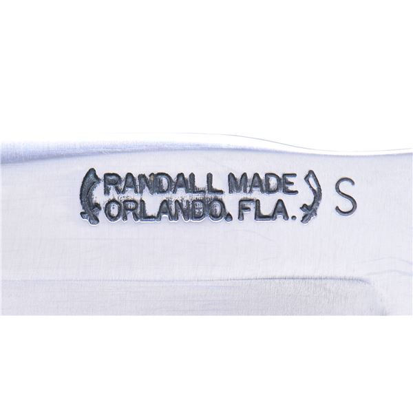 KNIFE, WITH JOHNSON ROUGH BACK SHEATH. Model 1-8 All Purpose Fighting knife produced by Randall. The left side of the blade is marked "RANDALL MADE/ ORLANDO, FLA." between 2 swords, followed by "S". Blade features a brightly polished finish, with an approx. 3 1/4" cutting edge on the forward portion of the spine. Blade measures 8" from the point to the bottom of the ricasso, with an overall length of 12 7/8". Solid wood handle, with red, white, and green spacers positioned beneath the brass full guard. UNATTACHED ACCESSORIES: brown leather Johnson Rough Back sheath, marked with Randall's mfg. information above "8" on the rear of the belt loop. Sheath is complete with its sharpening stone. CONDITION: excellent, with the blade retaining virtually all of its original high polished finish, with a couple of scratches present on the left side towards the point. Brass guard retains a pleasing patina. Wood grip is very good, showing some superficial handling marks. Sheath remains malleable, exhibiting some light wear, as well as some scattered spots of discoloration. (02-24415/MLW). $1,000-1,400.