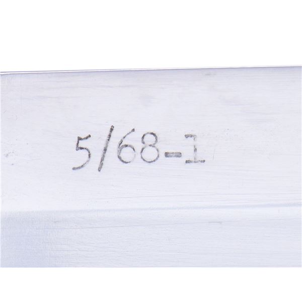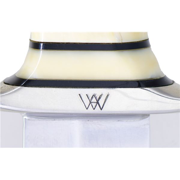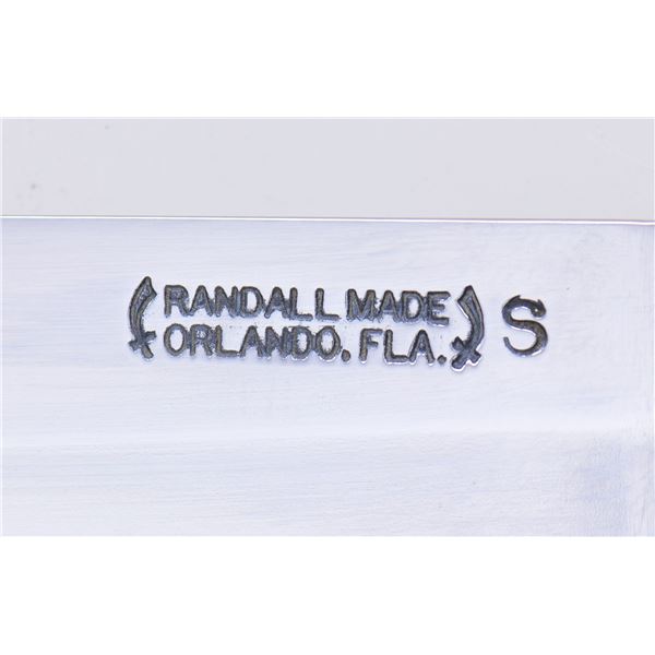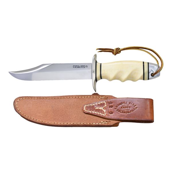 SHEATH. Model 12-6 knife mfg. by Randall in Orlando, FL. Left side of the blade is marked "RANDALL MADE/ ORLANDO, FLA." between 2 swords, followed by "S", with "5/68-1" marked on the right. Left side of the crossguard is marked with a "WVA" monogram. The clip point blade has been cleaned and polished, measuring 6 1/4" from the point to the base of the guard, with an overall length of 11". Custom white handle, featuring carved finger grooves, black spacers, and highly polished aluminum crossguard and pommel. UNATTACHED ACCESSORIES: Randall brown leather sheath, marked with Randall's mfg. information above "12 6" on the rear of the belt loop. CONDITION: blade is very good, as cleaned and re-polished, exhibiting very light pitting and some striations from cleaning overall, with an area of light to mild pitting present around the "5/68-1" marking. Handle retains a pleasing mellow patina, exhibiting some scattered superficial marks from handling and storage, with tight, stable minor cracks present at the rear. Sheath is very good overall. (02-24407/MLW). $700-1,000.