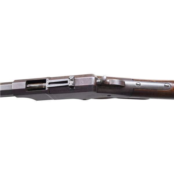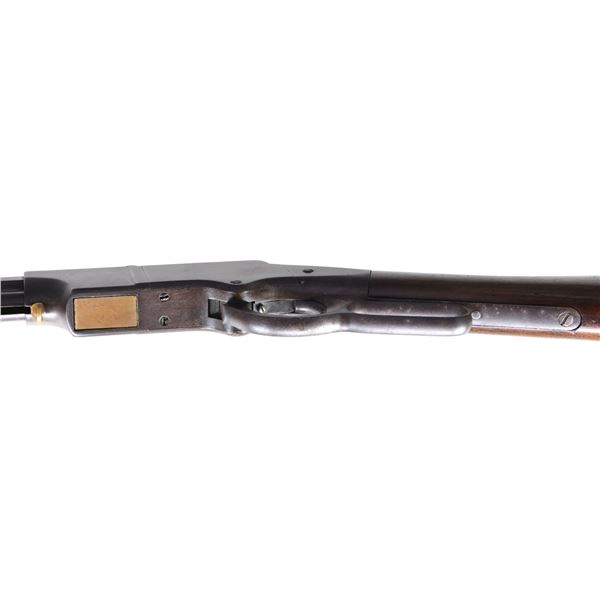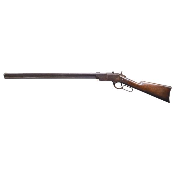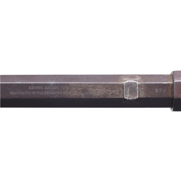 Cal. 44. S# 277. The 1st Henry Rifles were made with iron frames in a total production estimated 225-250, there are 98 survivors documented S# 1 to highest S# 355. 355 iron frames were not made as brass guns in same configurations are interspersed with few duplicate numbers. All early iron & brass up to about S# 400 have standard features including 1000 yard adjustable rear sight, brass half moon crescent inset front sight, earliest two line address with small fonts with mixed serif and san-serif fonts, measuring about 2.5" in length on 24 3/8" octagonal barrel with integral full length magazine sleeve, varnished straight grain walnut stock with correct large .92" diameter mortised cleaning rod chamber with extra shallow groove required for space for the largest early four piece wood and metal cleaning rod set which is still present. CONDITION: very good overall, "as found", smooth plum patina, good markings throughout. The scarce correct original 1000 yard sight is complete. Rifle is complete, matching and original throughout. The 3 tang screws and 2 butt plate screws have matching serial numbers as does stock, lower tang and butt plate. Good six groove rifled bore. Stock is tight and well fit retaining some original varnish with scattered staining and cosmetic blemishes. (01-26365/JS). ANTIQUE. $60,000-80,000.