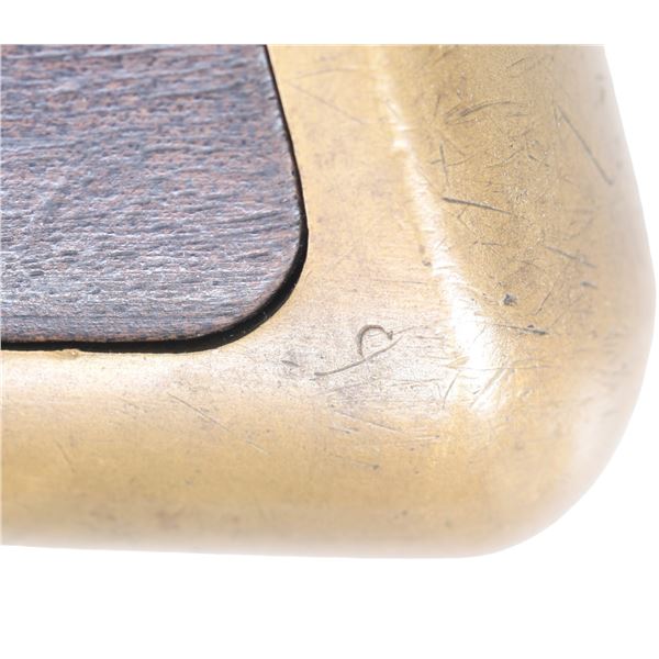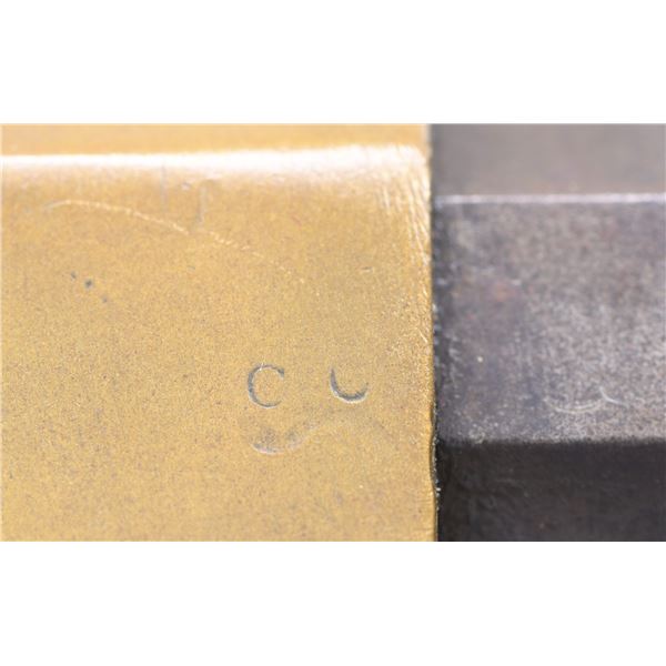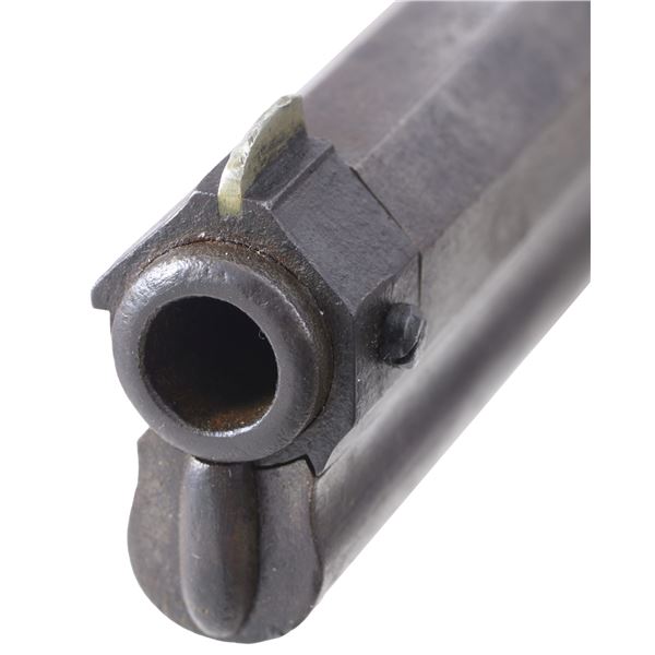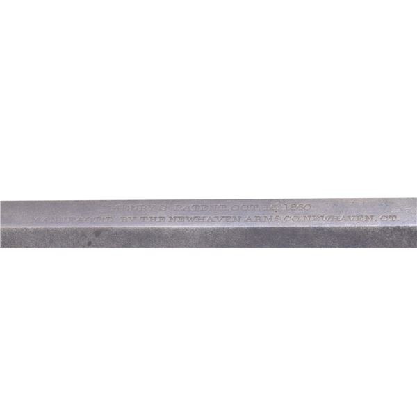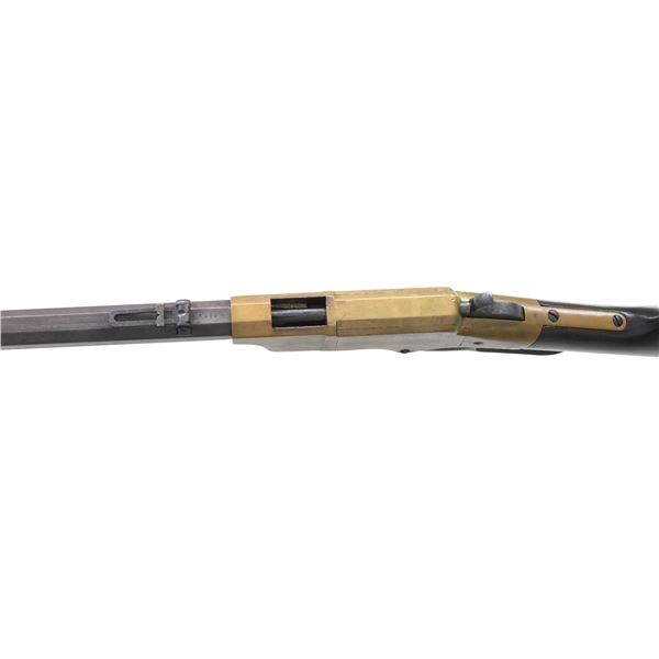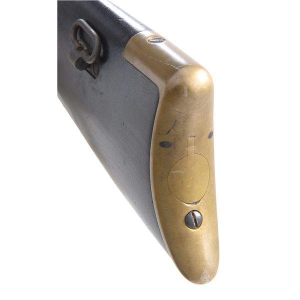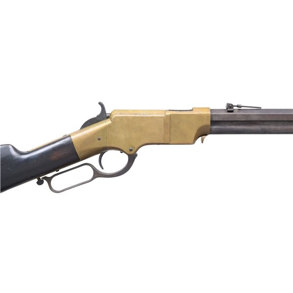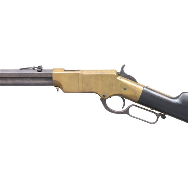 Cal. 44. S# 3989. This is a standard 4th variation Henry rifle made in 1863. 4th variation serial range about 3000-5000, with early DC cavalry guns all found in range 3001-3999 where this gun falls. There is portion of original CGC (Charles G. Chapman) inspection on frame and same small inspection "c" on right side of butt plate near top. The stock has been refinished and a spurious large font CGC has been stamped and also on barrel. These fake marks should be removed by a competent gunsmith and you will have an honest Civil War martial Henry at a very modest price. Standard configuration for all early martials, rounded butt plate with 7/8" wide trap door, .9" hole bored in butt stock to accept 4 piece wooden cleaning rod, lever latch on lower receiver tang and latch flange on rear of lever, has a milled flat along the magazine follower slot in lower front of receiver, large magazine follower with 5/8" wide finger tab, small .095 diameter trigger retaining pin, square back front sight blade, slanted profile to stock comb, straight profile to lower edge of stock, no "bump" on stock as stock has been sanded and refinished. Large font all serif 3.25" barrel address which began about S# 3500, sight dovetail milled in barrel only, six groove rifling, 900 yard rear sight with no slide stop screw. Serial number stamped on following parts: barrel behind rear sight dovetail, left side of lower receiver tang, top receiver tang channel in butt stock, inside bottom edge of butt plate. Usually butt plate screws with round edge 1st type butt plates are serial numbered and flatheaded to fit profile, both screws in this gun are either replaced or the round headed screws which were unserialized and started about 100 serial numbers higher as in this example. Matching assembly numbers stamped on rounded portion of barrel under loading sleeve and on rear edge of loading sleeve. CONDITION: good to very good overall, appears original throughout with exception of the added fake CGC stamped on right side of barrel and right side of stock. Other original markings are good and discernible, smooth patinaed brass, both sights original and complete, iron has a mottled brown patina. Stock is original though heavily sanded and refinished to hide crack or break repair at wrist. (01-26382/JS). ANTIQUE. $9,000-14,000.