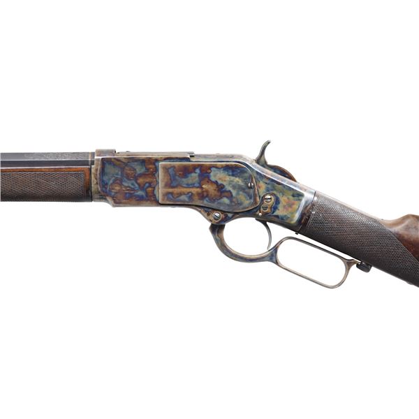 LEVER ACTION RIFLE. Cal. 44 WCF. S# 27184. Bbl. 24" octagon having a bead front w/ graduated leaf rear sight. This rifle is beautifully upgraded to 1 of 1000 configuration including addition of platinum bands & engraving at breech & muzzle ends of bbl. Top flat is marked " One of One Thousand". Case colored action, forend cap & crescent steel trap door buttplate. Mortised dust cover has 5/8" fine checkered oval thumb print. Forearm & straight grip stock of fancy black walnut w/ hand checkering. Left inside of lower tang has assembly number "617". UNATTACHED ACCESSORIES: Cody Firearms Museum show search form, "Date Shipped: 9-10-1877 / Order number: 9838 " Configuration information matches the upgraded features & style of this rifle. CONDITION: very good as upgraded. Bbl. & mag. tube retain 90% lightly faded blue showing edge wear. Mag. tube has two small dents on left side. Action retains 90% restored case colors showing slight edge wear. Stocks show moderate finish & checkering wear w/ scattered scratches & handling marks having a gap between the forearm & forearm cap. Hammer will not hold in cocked position unless trigger is pushed forward. Bolt will not fully retract allowing action to cycle, extractor & other parts may be replacements. Dark lightly pitted bore having largely intact rifling w/ a light ring a few inches from the muzzle. (01-26435/DS). ANTIQUE. $5,000-10,000.