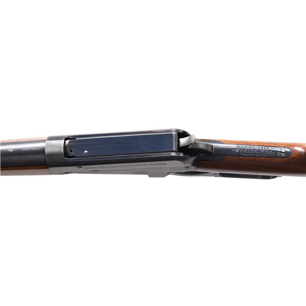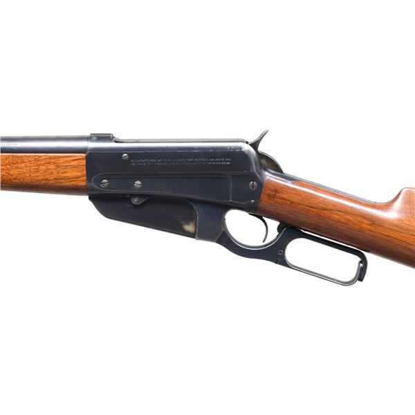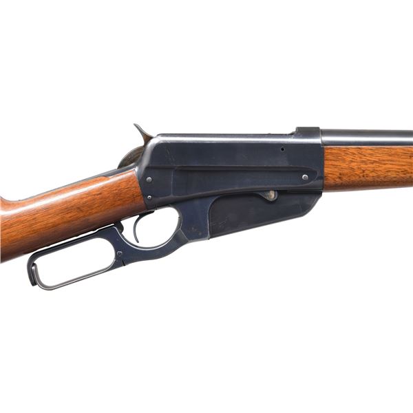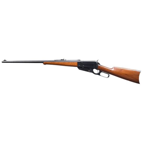 RIFLE CHAMBERED IN THE DESIRABLE 405 WIN CALIBER. Cal. 405 Win. S# 54981. Bbl. 24" round. Sporting rear sight w/ ramp mounted replacement white bead front sight. Schnable tipped walnut forearm w/ ebony insert. Straight grip walnut stock w/ case colored crescent steel buttplate. Toeline of stock has an added oval nameplate. Mfg. 1906. The model 1895 in the desirable 405 chambering is noted as being used by Teddy Roosevelt on his African safari. CONDITION: over 97% original blue. Original wood finish shows scattered scratches & marks. Bright near excellent bore. (24-6469/DS). CURIO. $7,000-10,000.