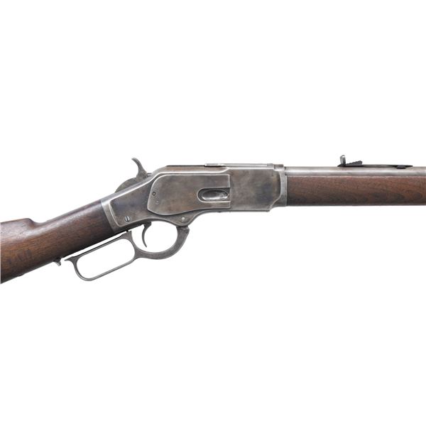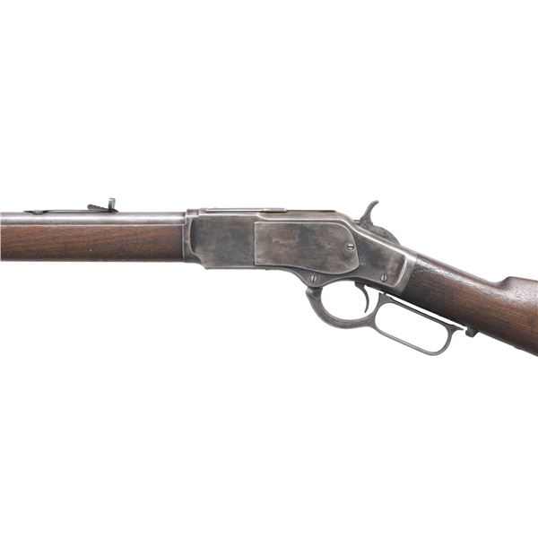 Cal. 38 WCF. S# 199602B. Bbl. 24" round w/ original sporting sights. Full length mag. Walnut forearm & straight grip stock w/ crescent steel trapdoor buttplate. Mfg. 1886. UNATTACHED ACCESSORIES: 4 piece steel cleaning rod held in stock compartment. CONDITION: metal has gray appearance from cold blue. Unsanded wood has dark worn appearance w/ scratches, marks & dents. Good mechanics. Bore has lightly worn rifling w/ very light pitting. (01-26842/DS). ANTIQUE. $2,000-2,700.