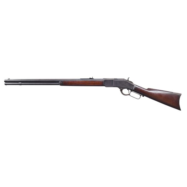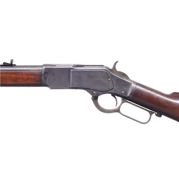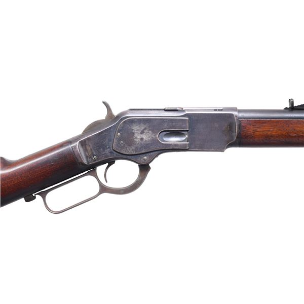 Cal. 44 WCF. S# 294931B. Bbl. 26" round w/ original sporting sights. Full length mag. tube. Blue finish w/ case colored hammer, lever & buttplate. Walnut forearm & straight grip stock w/ crescent steel trapdoor buttplate. Mfg. 1899. CONDITION: 50% dull lightly faded blue showing edge & carry wear w/ spots of dull fading appearance. Hammer & lever have faint traces of case colors. Original wood finish shows light wear w/ scattered scratches & marks. Sound mechanics. Bore is generally bright w/ very light pitting, retaining sound rifling. (01-26839/DS). ANTIQUE. $2,500-3,500.