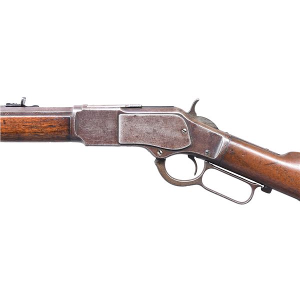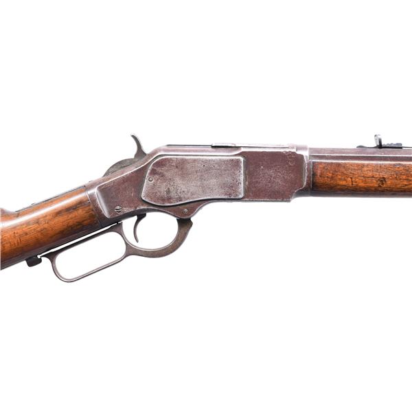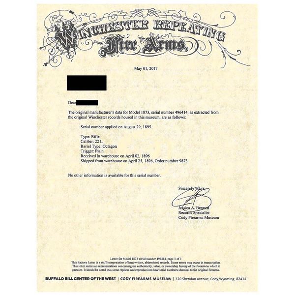 Cal. 22 Long. S# 496414B. Bbl. 24" octagon w/ sporting sights. Full length mag. Walnut forearm & straight grip stock w/ crescent buttplate. UNATTACHED ACCESSORIES: Winchester Repeating Fire Arms letter, "Type: Rifle / Caliber: 22 L / Barrel Type: Octagon / Trigger: Plain / Received in warehouse on April 02, 1896 / Shipped from warehouse on April 25, 1896, Order number 9873". CONDITION: metal finish has faded to brown, showing dents & handling marks. Wood finish shows moderate wear w/ small dents & scratches, having small spots of darkened appearance near the forearm tip. The stock has a small crack extending from the right side of the action. Functioning mechanics. Lever hangs slightly loose. Dark bore retains partially intact rifling. (01-26534/DS). ANTIQUE. $2,750-3,500.