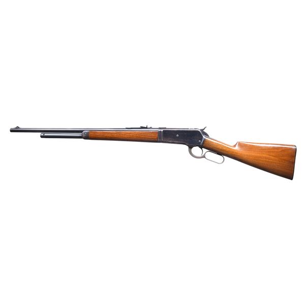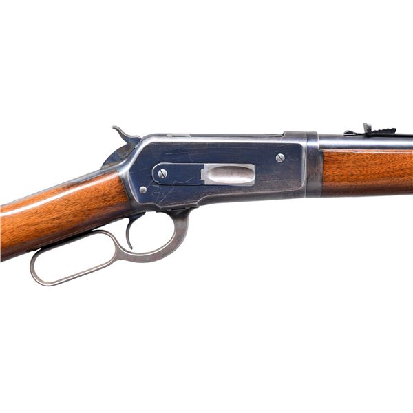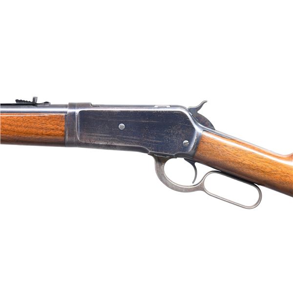 RIFLE. Cal. 45-70. S#. 128295. Bbl. 22" round takedown style. Lyman No. 4 Hunting rear sight w/ sporting rear sight. 3/4 length takedown mag. Blue finish w/ case colored hammer & lever. Walnut forend & straight grip stock w/ hard rubber buttplate. Mfg. 1902. CONDITION: over 95% bbl. & mag tube blue. Action retains 70% thinning blue showing flaking, carry wear & scratches. Lever retains a small amount of case colors. Hammer has good case color on it's sides. Original wood finish shows scattered scratches & marks. Peak of comb has a series of 8 intentionally cut "kill notches". Very good bright bore. (25-956/DS). CURIO. $3000-4000.