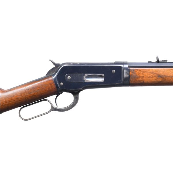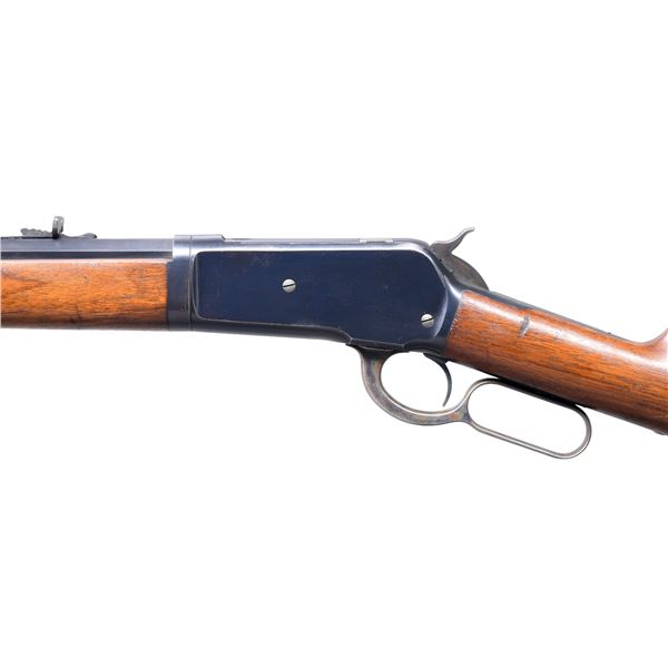 Cal. 45-90 WCF. S# 133096. Bbl. 26" octagon of takedown style. Original sporting sights. Full length takedown mag. Blue finished w/ case colored hammer & lever. Walnut forearm & straight grip stock w/ crescent steel buttplate. Mfg. 1905. CONDITION: all original retaining over 80% blue showing some edge & carry wear w/ scattered scratches & spots of freckling. Hammer & lever retain 60% lightly faded case colors. Buttplate has a small amount of fading case colors. Original wood finish shows wear w/ scattered scratches, marks & small dents. Sound action. Bore is generally bright w/ lightly worn rifling showing scattered spots of light pitting. (25-1482/DS). CURIO. $4,000-6,000.