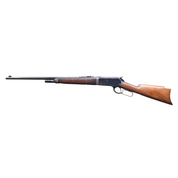 LEVER ACTION RIFLE. Cal. 33 WCF. S# 156015. Bbl. 24" tapered round of takedown style. Half length takedown mag. Ramp mounted replacement white bead front sight. Sporting rear sight is altered to resemble flat type style. Blue finished w/ case colored lever. Original walnut forearm shows deep gouges along bottom & right sides. Poorly fit replacement straight grip stock cut for crescent steel buttplate, buttplate is not present. Mfg. 1918. CONDITION: 70% lightly faded blue showing carry & edge wear. Lever retains traces of case colors. Forearm has worn finish showing gouges. Stock is partially sanded w/ a light coat of finish showing handling marks. Good mechanics. Bore retains sound rifling. (25-1479/DS). CURIO. $1,000-1,500.