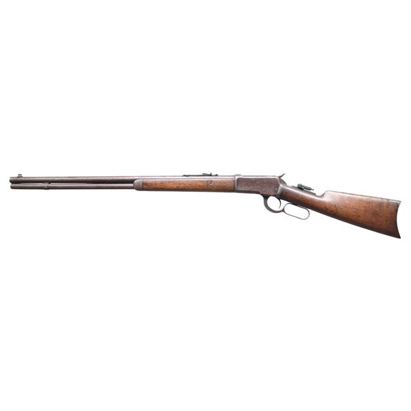 Cal. 38 WCF. S# 11079. Bbl is 24" rnd. Replacement front sight with broken bead, sporting rear sight w/ combination tang sight. Full length mag. Walnut forearm w/ straight grip stock w/ crescent steel buttplate. Manufacture date 1893. CONDITION: blue has largely faded to brown showing surface corrosion. Wood has heavily worn appearance w/ scratches, dents and marks. Bore retains lightly worn rifling and scattered spots of light pitting. (01-26854/DS). ANTIQUE. $800-1,200.