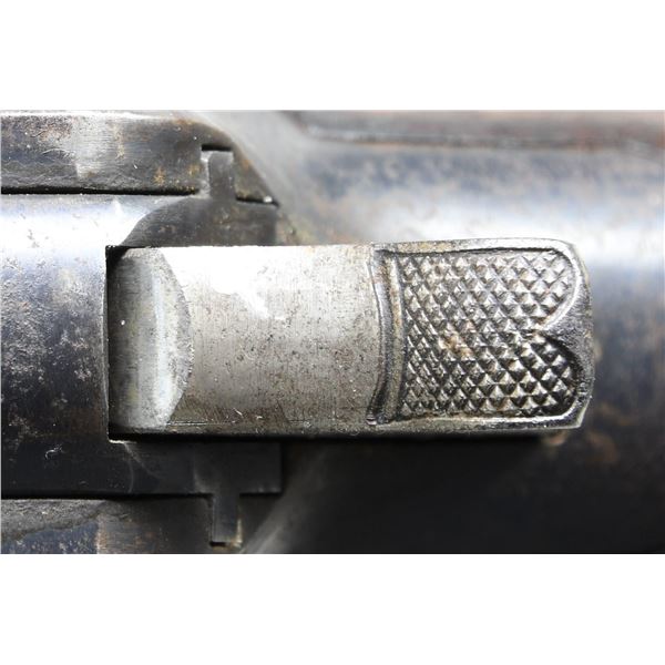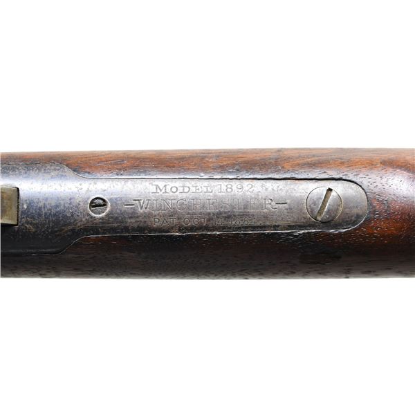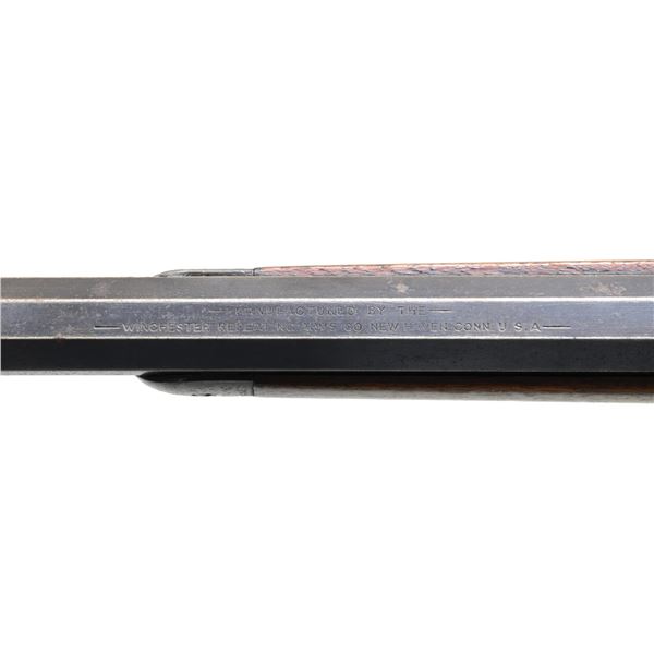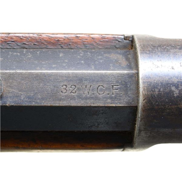 Cal. 32 WCF. S# 67991. Bbl is 24" octagonal w/ sporting sights. Full length mag. Walnut forearm w/ straight grip stock w/ crescent steel buttplate. Manufacture date 1894. CONDITION: over 60% dull blue showing carry and edge wear with spotted surface corrosion. Wood has worn appearance w/ dents, scratches and marks. Sound action. Bore has darkened appearance retaining sound rifling. (01-26855/DS). ANTIQUE. $1,000-1,500.