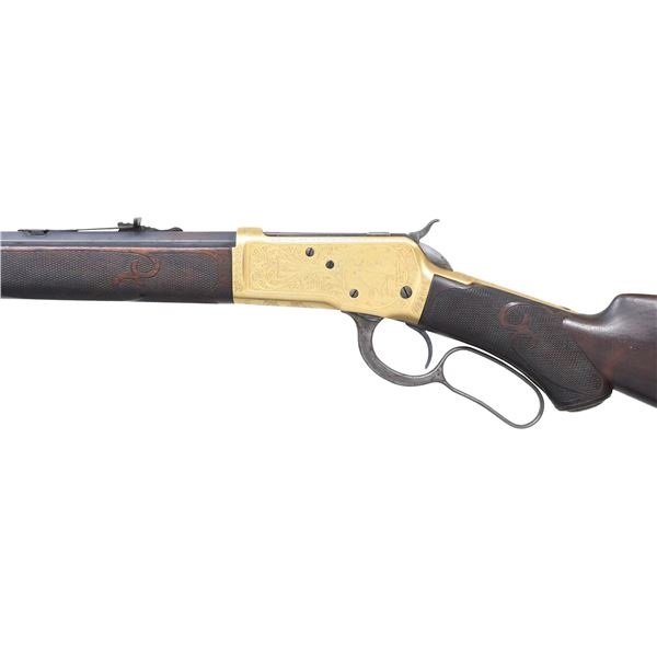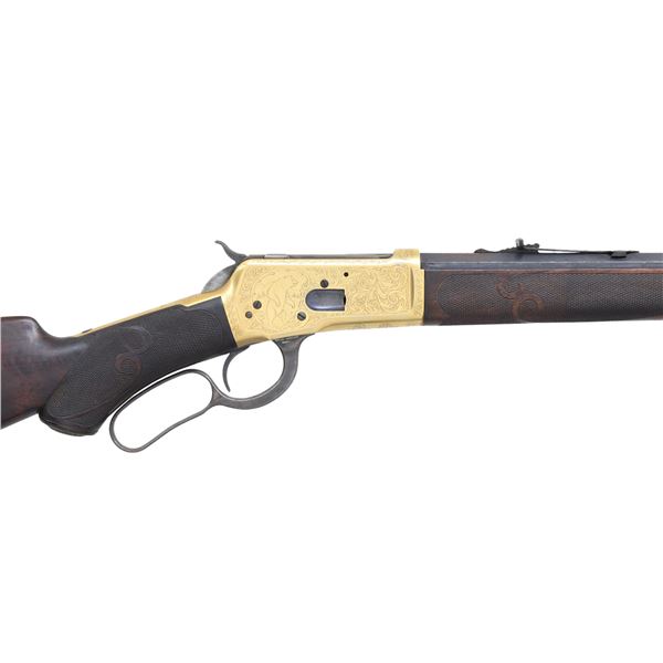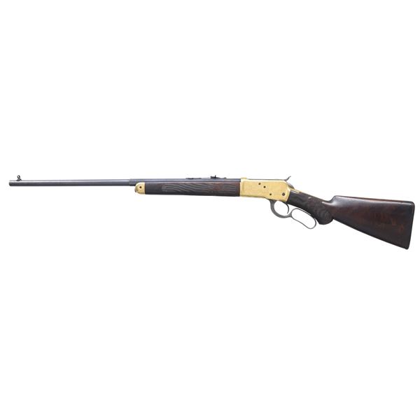 RIFLE. Cal. 44 WCF (44-40). S# 141701. Bbl. 24" half round w/ combination front sight & flat top sporting rear sight. Receiver & forearm cap have custom hand engraving & gold plated finish. Action has generous coverage of arabesque scroll surrounding vignettes of a grizzly on the right & a bull elk on the left. Complimentary scroll w/ border & geometric highlights extends to upper & lower receiver areas along w/ forearm cap. Walnut forearm & pistol grip stock w/ hard rubber grip cap & hard rubber shotgun buttplate. Forearm & wrist of stock have custom segmented borderless hand engraving. UNATTACHED ACCESSORIES: included is a Cody Firearms Museum Records Office Show Search Form detailing the following information, "SN Applied: 5/21/1900". No other information is listed. CONDITION: action & forearm cap retain 95% custom gold finish showing light edge wear. Bbl. blue is fading showing scattered spots of freckling & very light pitting. Lever retains faint traces of case colors in protected areas. Refinished wood shows light wear w/ scattered handling marks. Sound action. Bore is bright w/ strong rifling. (25-1017/DS). CURIO. $1,500-2,500.