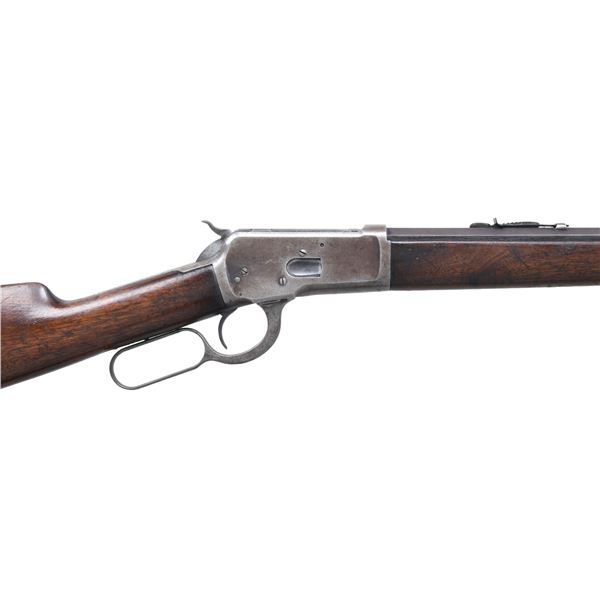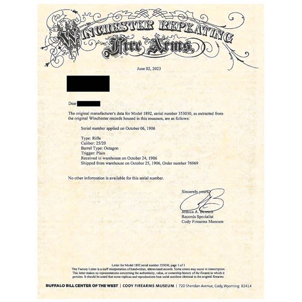 Cal. 25-20. S# 353030. Bbl. 24" octagon. Replacement sporting front sight & elevator adj. rear sight. Full length mag. Walnut forearm & straight grip stock w/ crescent steel buttplate. UNATTACHED ACCESSORIES: included is a letter Winchester Repeating Arms detailing the following information about this rifle, "Type: Rifle / Caliber: 25/20 / Barrel Type: Octagon / Trigger: Plain / Received in warehouse on October 24, 1906 / Shipped from warehouse on October 25, 1906, Order number 76969". CONDITION: bbl. & mag. tube retain 30% dull fading blue. Action has largely faded to gray. Stocks have added finish over heavy wear & numerous handling marks. Left side of stock has a crack extending from the buttplates. Bright bore retains strong rifling. (25-660/DS). CURIO. $1,000-1,500.