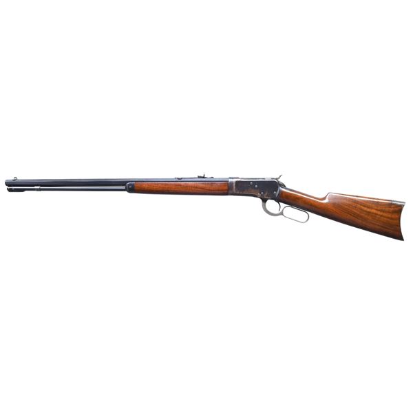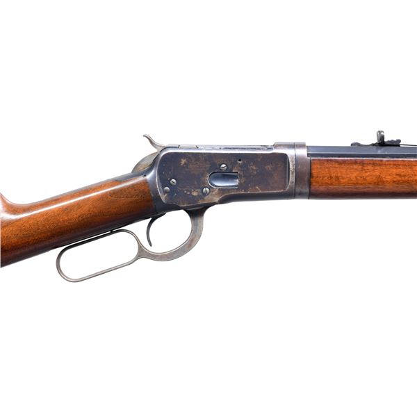 Cal. 25-20. S# 620429. Bbl. 24" octagon of takedown style. Sporting sights. Full length mag. Blue finish w/ case colored hammer & lever. Walnut forearm & straight grip stock w/ crescent steel buttplate. Mfg. 1911. CONDITION: bbl. & mag. tube retain over 90% blue. Action has 70% blue w/ areas of fading. Hammer & lever have some lightly visible case colors. Wood has good original finish showing scattered scratches & marks. Sound mechanics. Bore is bright w/ sound rifling showing a very faint ring near the muzzle. (25-742/DS). CURIO. $2,500-3,500.