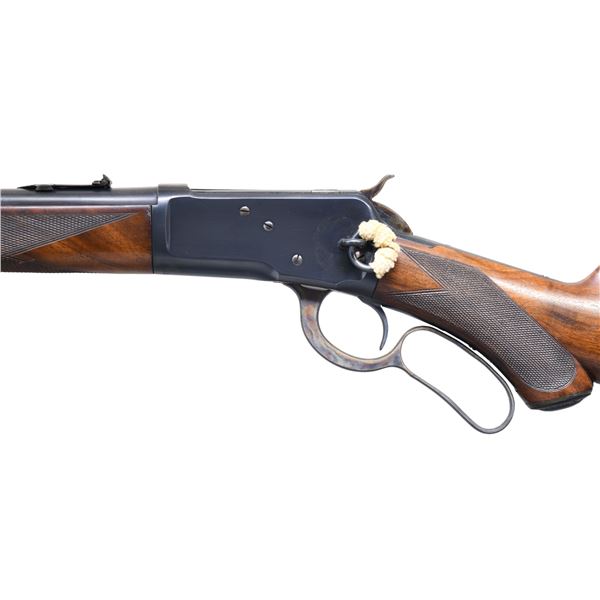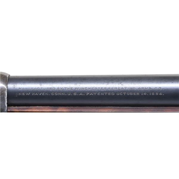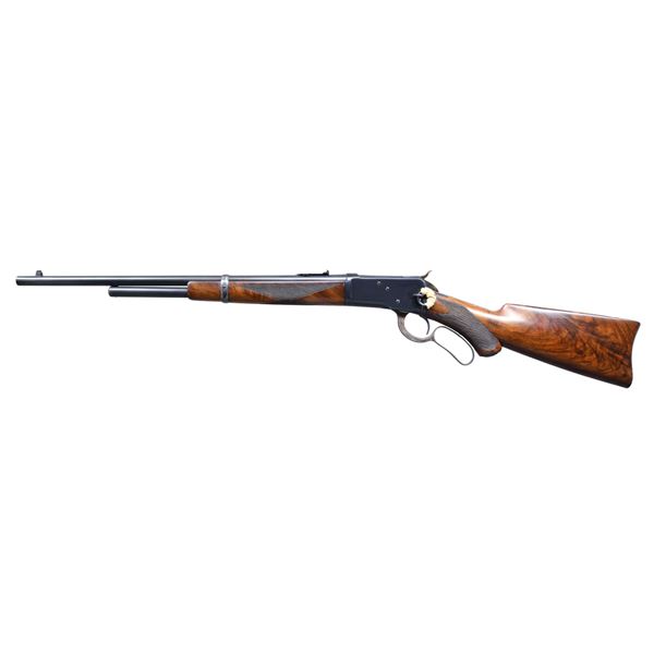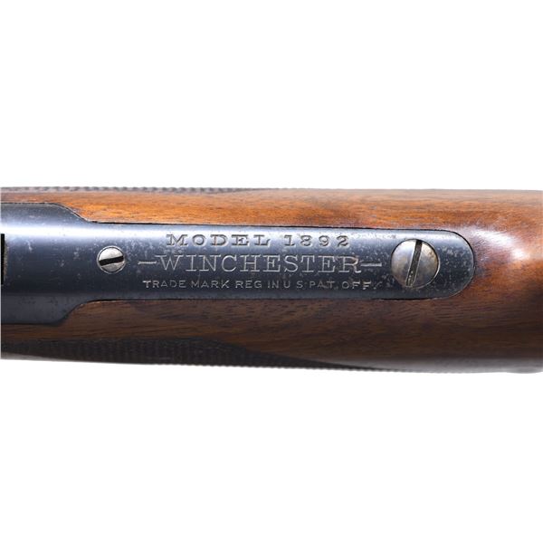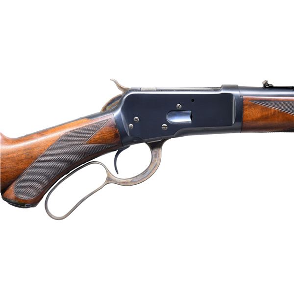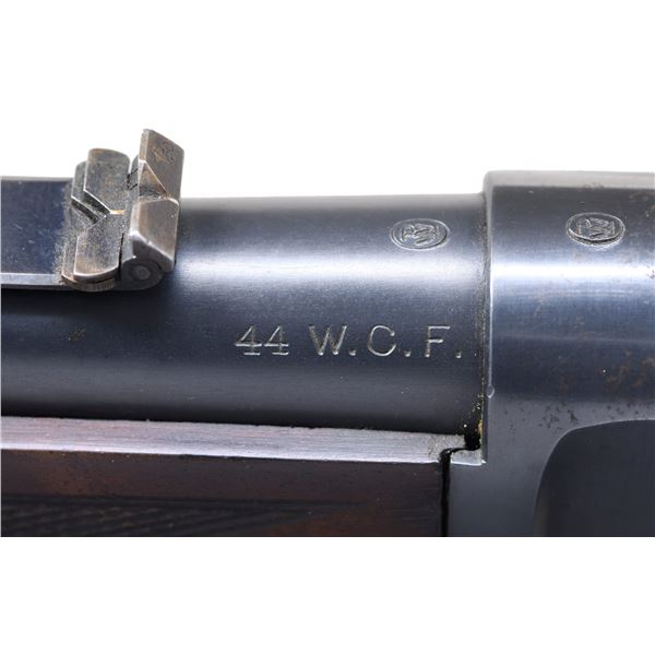 LEVER ACTION SRC. Cal.44 WCF. S# 673517. Bbl. 20" round. Pinned blade front w/ Winchester Express rear sight. Mag. tube is 3/4 length. Action has saddle ring on left side. Blue finish w/ case colored hammer & lever. Carbine forend & hard rubber capped pistol grip stock of XX fancy walnut w/ steel carbine buttplate. Stock & forend have style "H" factory checkering. Left inside of lower tang is marked w/ assembly number 1113 followed by wood grade marking XX. Top tang channel of stock has matching assembly number 1113. Mfg. 1912. CONDITION: Beautifully restored carbine. Bbl. & action retain 98% properly restored Blue & case colored finish. The stock is lightly refinished having freshened checkering. Buttplate has lightly faded blue showing spots of freckling. Right side of grip cap has a small chip. Very good bright bore. (25-1306/DS). CURIO. $2,500.-3,500.