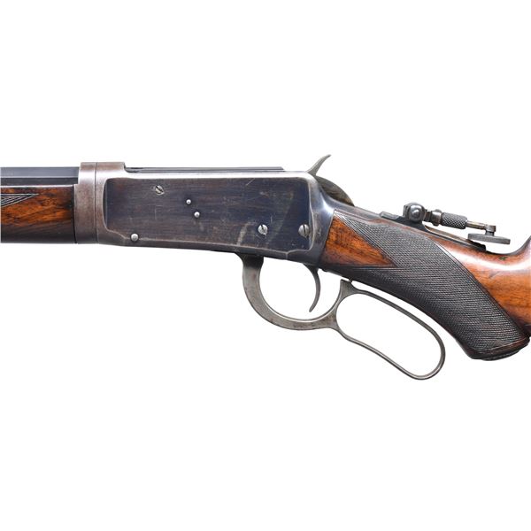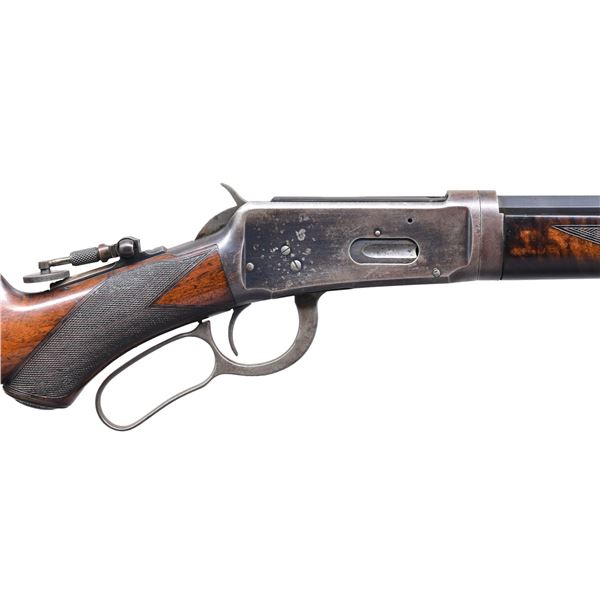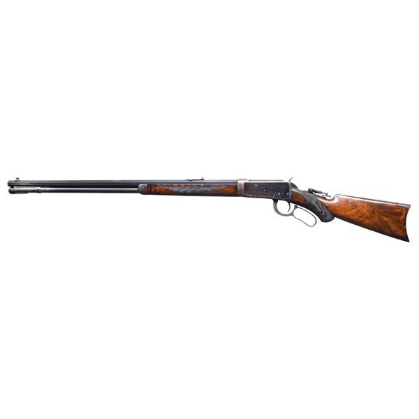 RIFLE. Cal. 30 WCF, provided letter lists cal. as 38/55, possibly a mistake. S# 15315. Bbl. 26" octagon. Lyman No.3 front sight w/ missing bead, Winchester express rear sight & combination tang sight w/ large disc aperture. Full length takedown mag. Blue finish w/ case colored hammer & lever. Forearm & hard rubber capped pistol grip stock of fancy walnut w/ crescent steel buttplate. Left inside of lower tang has assembly number "2970" followed by wood grade marking "XXX". UNATTACHED ACCESSORIES: included is a letter from Winchester Repeating Fire Arms detailing the following information, "Rifle / 38/55 / Octagon barrel / Plain trigger / Checkered stock with pistol grip / Take-down / Received in the warehouse on June 29, 1896 / Shipped from the warehouse on June 30, 1896, order number 13275 / Returned and repair on November 7, 1898, order number 13167". CONDITION: over 70% lightly faded blue showing edge wear w/ carry wear on action. Hammer & lever have traces of case colors. Wood has lightly worn checkering & finish showing scratches & marks. Sound action. Bore has slightly darkened appearance retaining strong rifling. (01-26541/DS). ANTIQUE. $5,500-7,500.