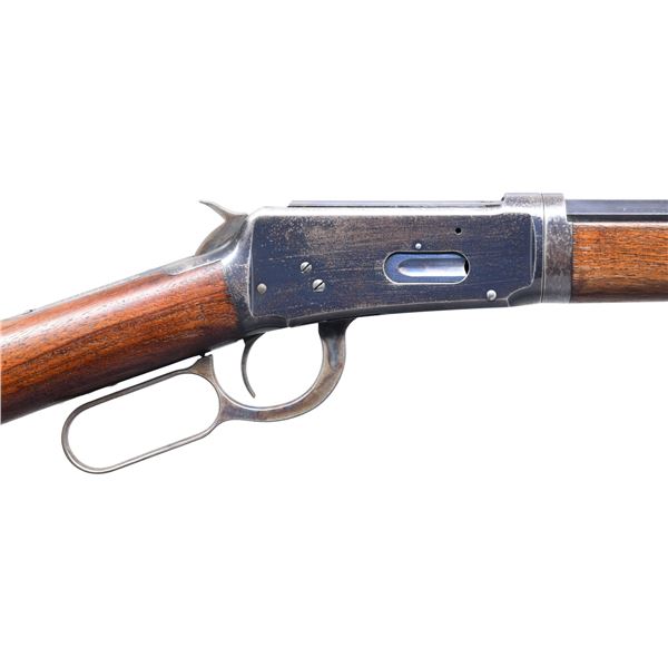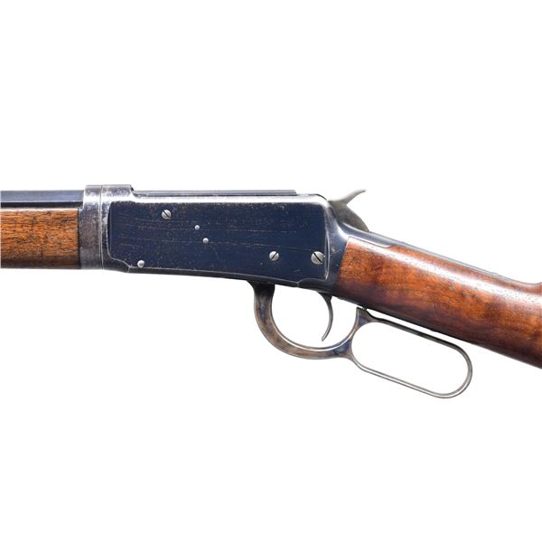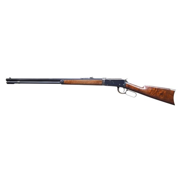Cal. 38-55. S# 97859. Bbl. 26" octagon of takedown style. Lyman No.4 front sight w/ sporting rear sight. Full length mag. Blue finish w/ case colored hammer & lever. Forearm & straight grip stock of nicely grained walnut w/ crescent steel buttplate. UNATTACHED ACCESSORIES: included is a Cody Firearms Records Office letter detailing the following information, "Serial number applied on October 23, 1900 / Type: Rifle / Caliber: 38/55 / Barrel Type: Octagon / Trigger: Plain / Takedown / Received in warehouse on May 31, 1901 / Shipped from warehouse on June 10, 1901, Order number 99718". CONDITION: over 80% original blue showing light edge wear on bbl. w/ spotting flaking on action. Hammer & lever retain over 30% case colors. Stock & forearm have moderately worn finish w/ scattered scratches & marks. Sound action. Bore retains strong rifling. (01-26542/DS). ANTIQUE. $3,500-5,000.
