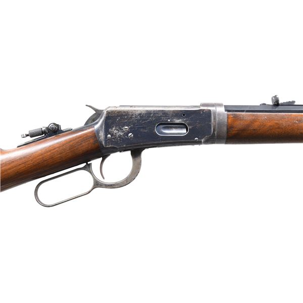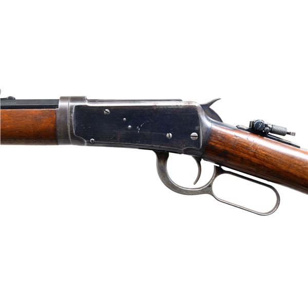 Cal. 32 WS. S# 224234. Bbl. 26" octagon. Sporting front & rear sights w/ Lyman combination tang sight. Full length takedown style mag. Blue finish w/ case colored hammer & lever. Walnut forearm & straight grip stock w/ crescent steel buttplate. Mfg. 1901. CONDITION: 80% original blue showing carry wear w/ spots of finish loss & corrosion. Stocks show finish wear w/ numerous scratches & marks. Bore retains strong rifling. PROVENANCE: The estate collection of Don "Duck" Combs. (24-2465/DS). CURIO. $1,200-1,800.