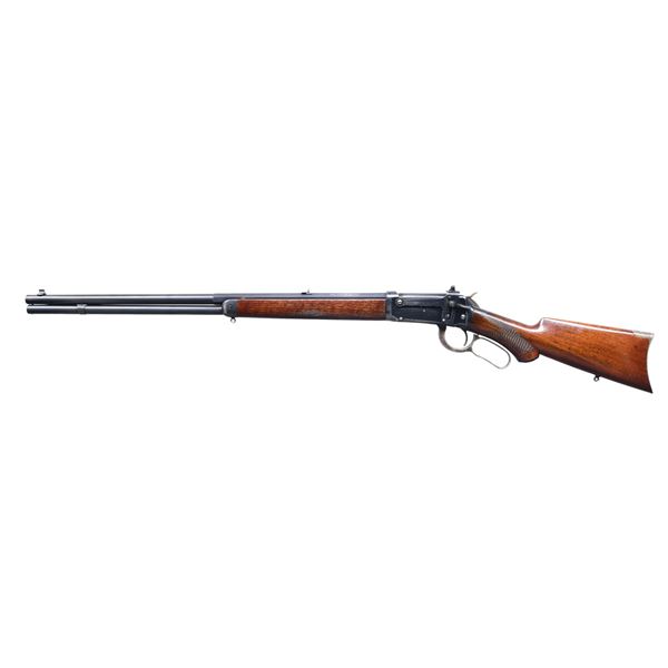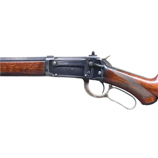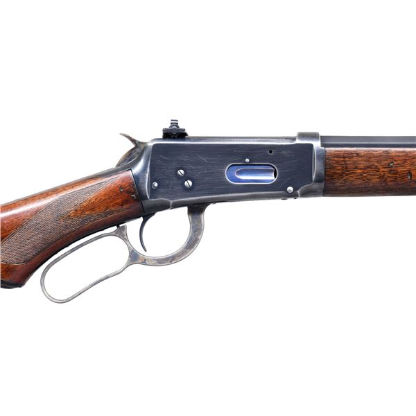 RIFLE. Please note as of 5/5/25 this item description has been updated. Please revisit this description and contact us with any questions. Cal. 32 WS. S# 424797. Bbl. 24" octagon to round, two inches shorter than standard. Bead sporting front sight & Lyman No.6 folding leaf rear sight w/ Lyman No.38 "Climbin' Lyman" receiver sight. Full length mag. Blue finished w/ case colored hammer, lever & buttplate. Standard 9 3/8" forearm & hard rubber capped pistol grip walnut stock w/ crescent steel buttplate, Winchester sling eyes & style "I" factory checkering. Left inside of lower tang has assembly # 6056 followed by "CH". UNATTACHED ACCESORIES: Cody Firearms Museum Records Check listing the following: Serial number applied on November 17, 1908 / Configuration information not available. CONDITION: 90% lightly faded original blue showing edge & carry wear. Hammer, lever & buttplate retain 70% lightly worn case colors. Wood has a light coat of added finish over light finish & checkering wear showing scattered handling marks. Bore retains lightly worn rifling. (25-735/DS). CURIO. $5500-7500.