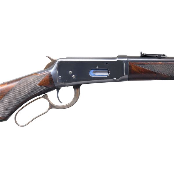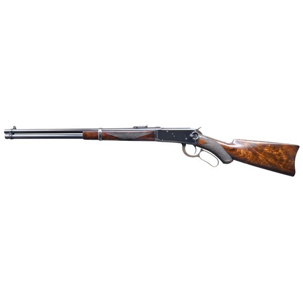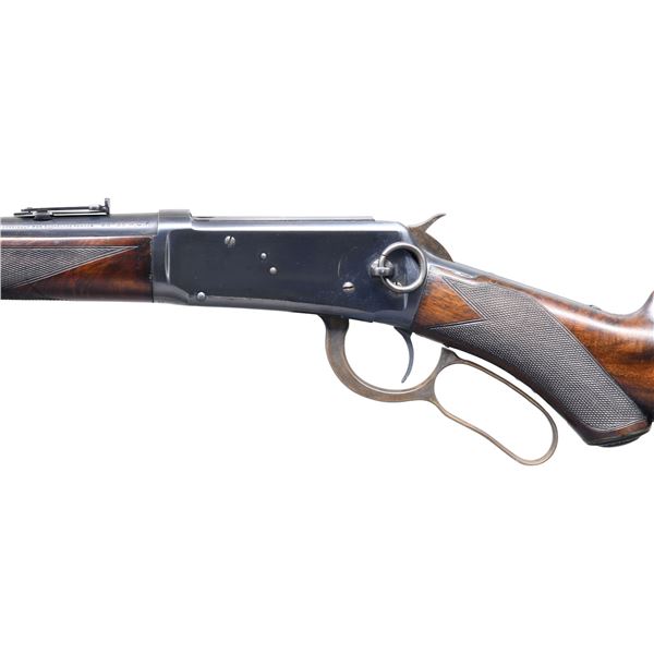 Cal. 25-35 WCF. S# 484241. Bbl. 20" round. Pinned blade front sight w/ graduated leaf carbine rear sight. Full length mag. Blue finish w/ case colored hammer & lever. Action has saddle ring on left side. Band fastened carbine forearm & hard rubber capped pistol grip stock of XXX fancy walnut w/ case colored carbine buttplate. Stock & forearm have style H factory checkering. Left inside of lower tang is stamped w/ assembly number "2014" followed by wood grade marking "XXX". Top tang channel of stock has matching assembly number "2014". Mfg. 1909. CONDITION: bbl., mag. tube & action retain 95% original blue showing light edge wear & small spots. Hammer & lever have 90% lightly faded case colors. Buttplate has dark fading case colors. Original wood finish shows scattered small marks. Forearm has a open grain check running from side to side 2" to 3" forward of the action. Dark bore w/ worn rifling. (25-1333/DS). CURIO. $2,500-4,000.