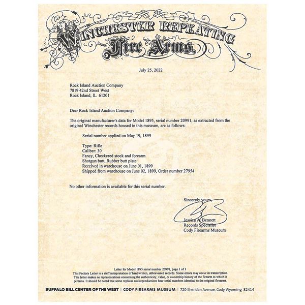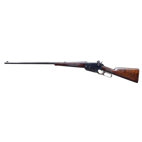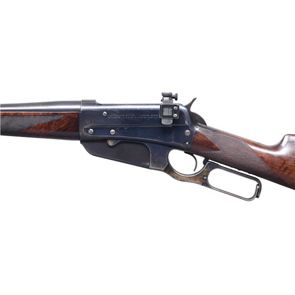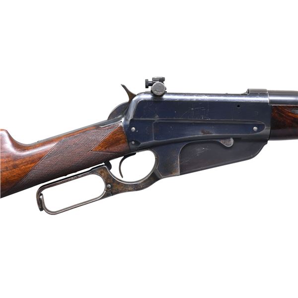 Cal. 30 U.S. (30-40 Krag). S# 20991. Bbl. 28" tapered round. Pinned German silver blade front sight, Lyman no.6-W folding leaf rear sight w/ a Redfield receiver sight. Blue finish w/ case colored hammer. Schnable tipped forearm w/ ebony insert & straight grip stock of fancy walnut w/ style H factory checkering & checkered steel shotgun style buttplate. Top tang channel of stock has partially visible assembly number that appears to be "995". UNATTACHED ACCESSORIES: Winchester Repeating Fire Arms letter, "Type: Rifle / Caliber: 30 / Fancy, checkered stock and forearm / Shotgun butt, rubber butt plate / Received in warehouse on June 01, 1899 / Shipped from warehouse on June 02, 1899, Order number 27954". CONDITION: over 90% original blue, showing light carry wear w/ scratches on receiver. Lever shows areas fading to brown. Lightly refinished stock retains very good checkering, showing some small marks. Bore is generally bright w/ strong rifling. (25-243/DS). CURIO. $5,000-7,500.