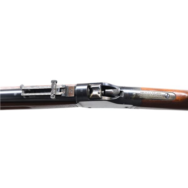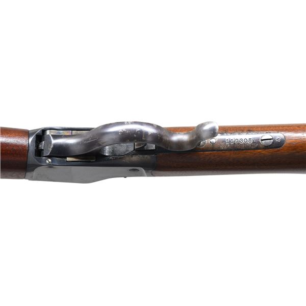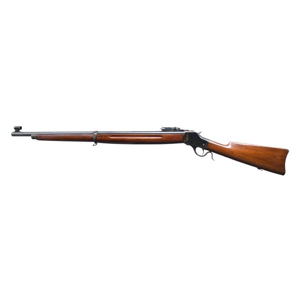 Cal. 22 LR. S# 119305. Bbl. 28" round. Ramp mounted globe front sight w/ graduated leaf musket rear sight. Band fastened finger groove musket length forearm & straight grip stock w/ steel musket buttplate & sling swivels. Model 1885 production ended in 1923 w/ S# 139700. CONDITION: over 90% original blue showing small scratches w/ spots & flaking on action. Stocks show light finish scratches, dents & marks. Very good bore. (24-6471/DS). CURIO. $1,000-1,500.